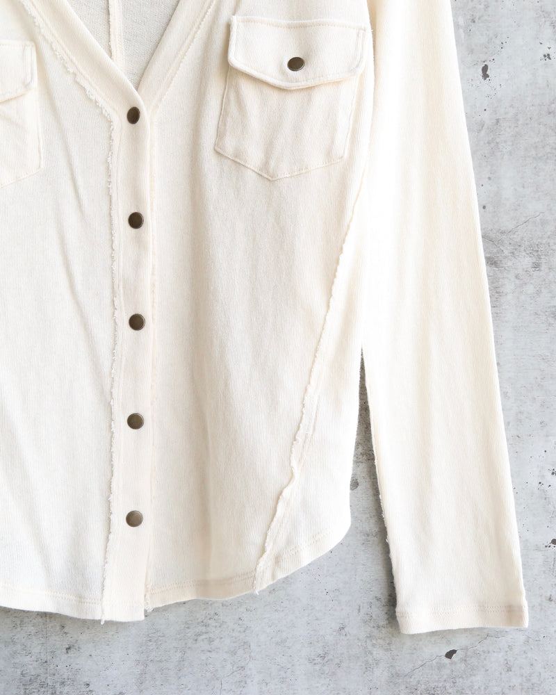 This woven cotton buttondown top features snap closures, a raw trim, double bust pockets, and a v-neckline. Wear this with your favorite pair of jeans for a cute and casual outfit!