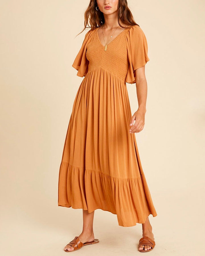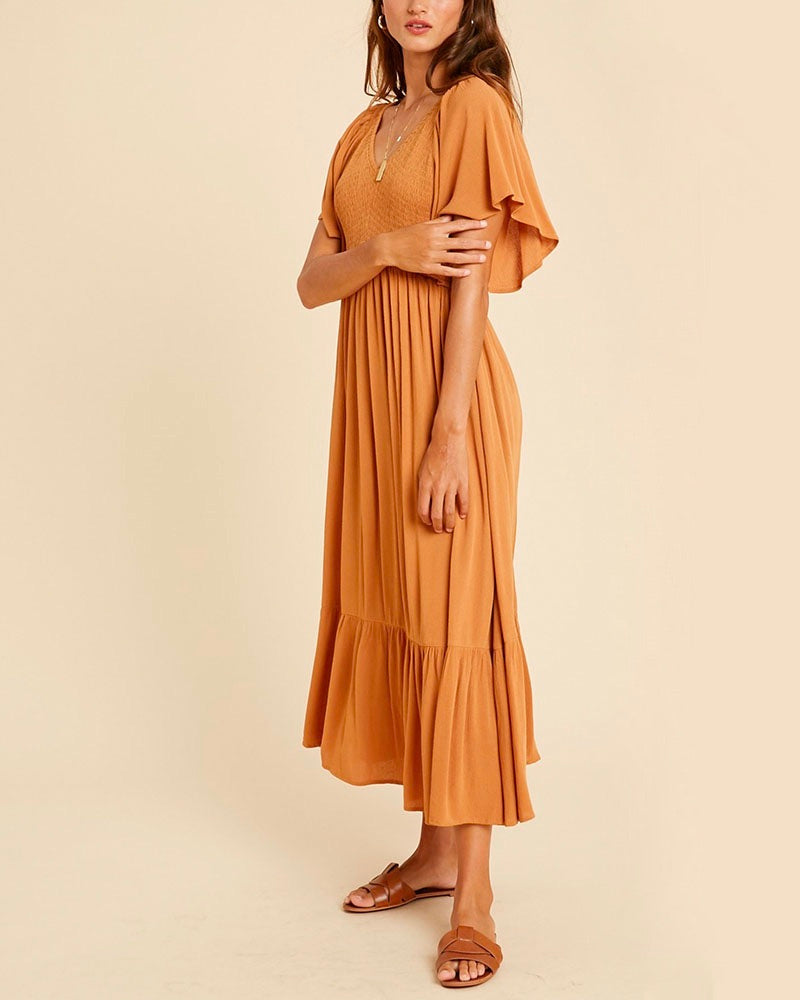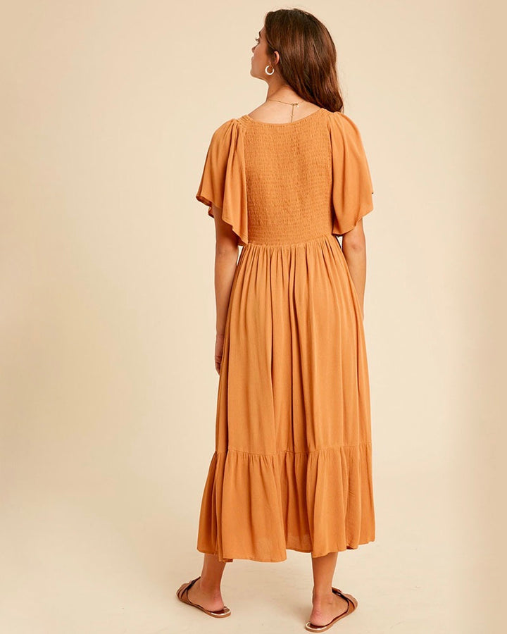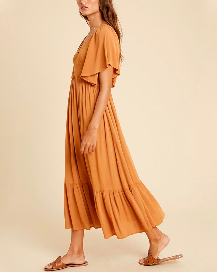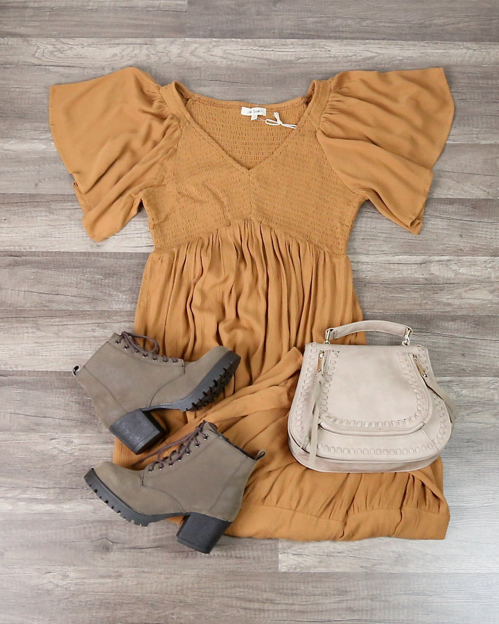 This midi dress is super cute and perfect for those days out! Featuring flutter sleeves, smocked bust, and a ruffle hem, this dress is perfect when paired with some sandals!