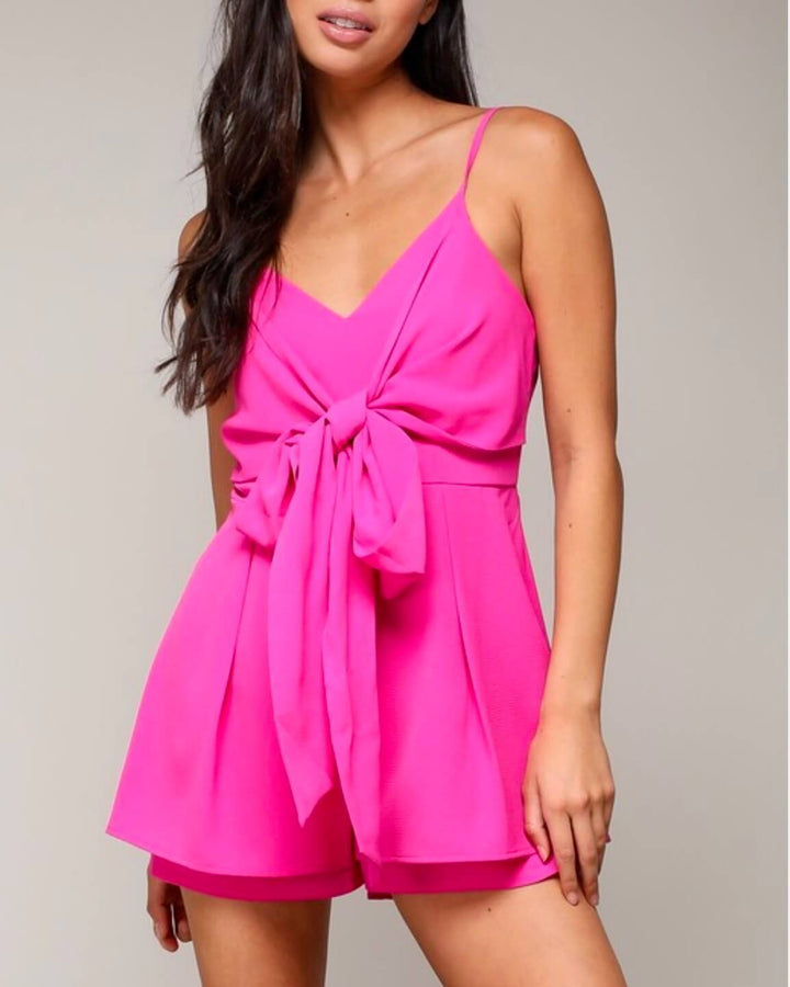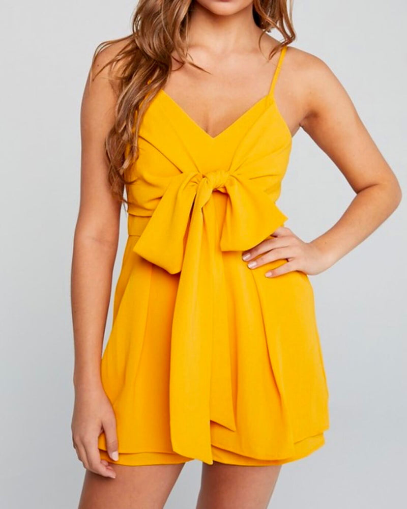 This cute romper with spaghetti straps and a front ribbon tie is perfect for any formal event. Pair this with your favorite heels for a cute yet formal look.