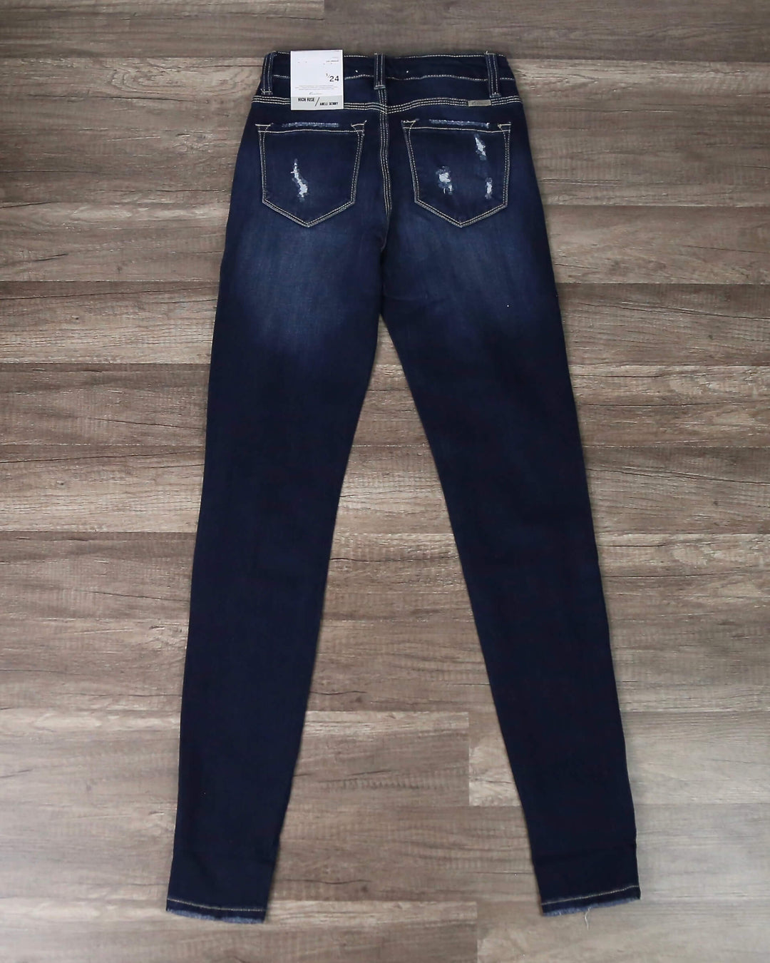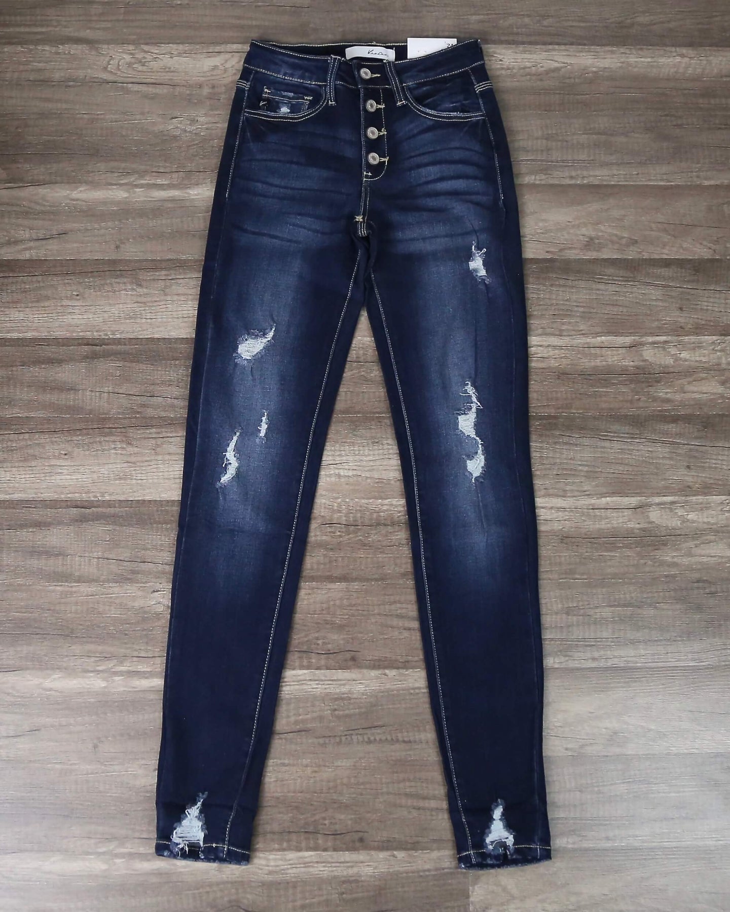 With its unique button front, these distressed skinny jeans are one-of-a-kind. You don't want to miss out on these jeans! They're easy to style and easy to wear with its medium wash jeans style. Wear with a casual tee and sneakers for a casual look or with a blouse and high heels for a dressy casual look!