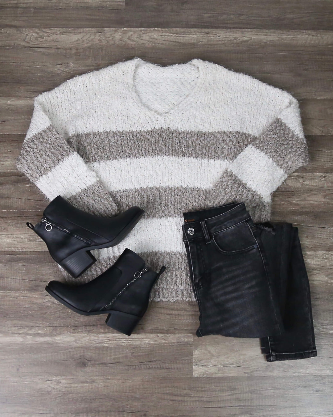 This striped fuzzy knit sweater with a side slit and v-neck is perfect for a cozy outfit. Wear this in the winter to stay warm and cozy while looking cute!