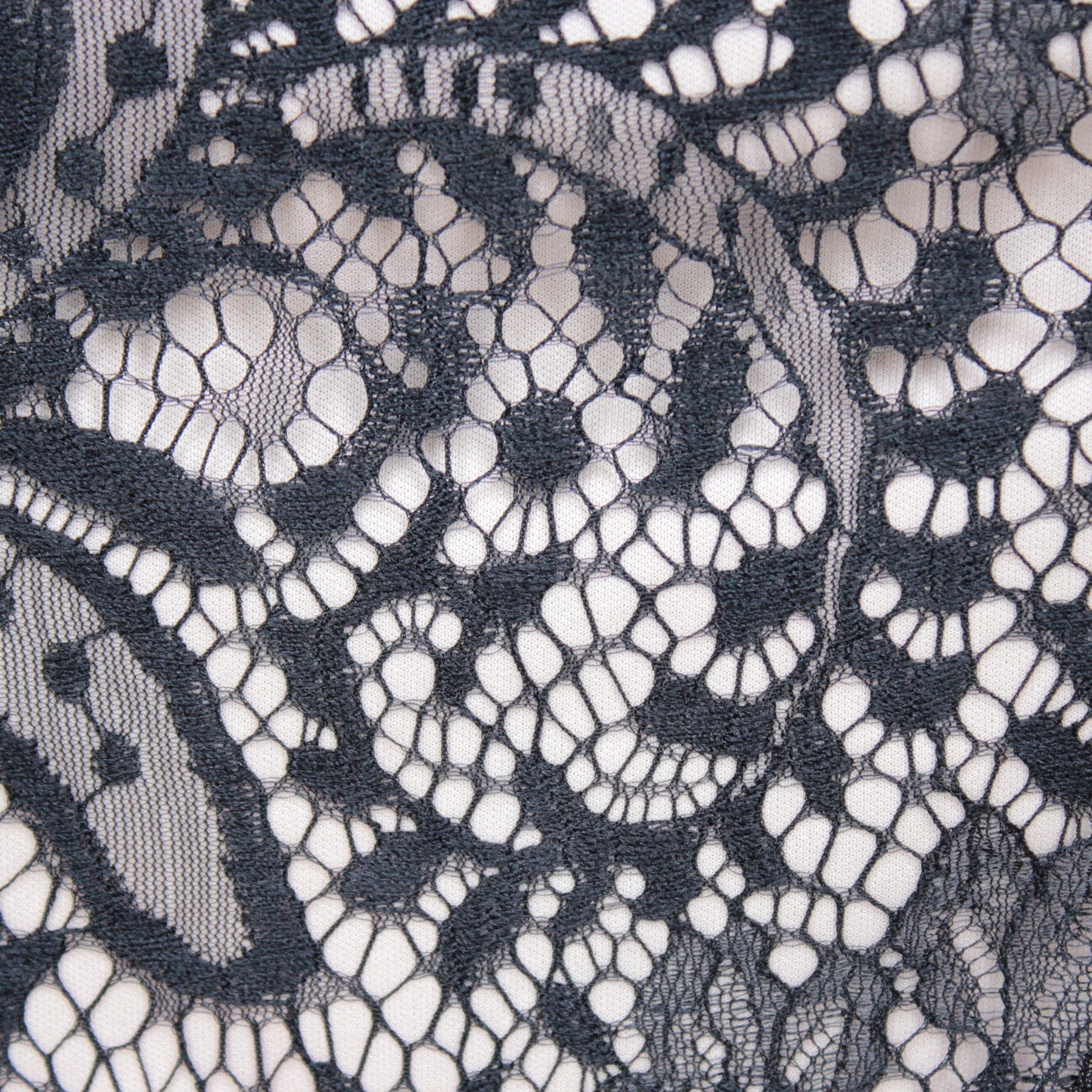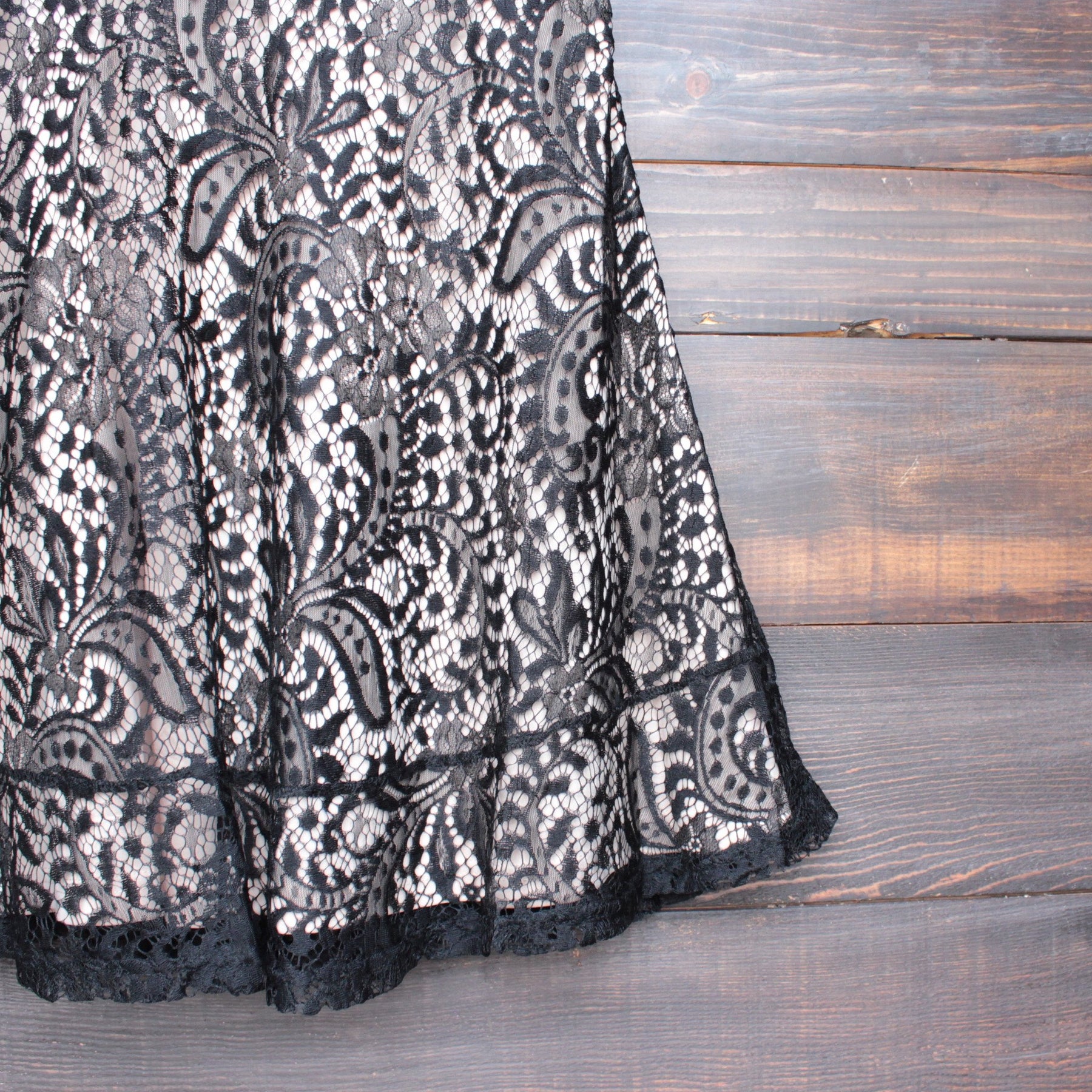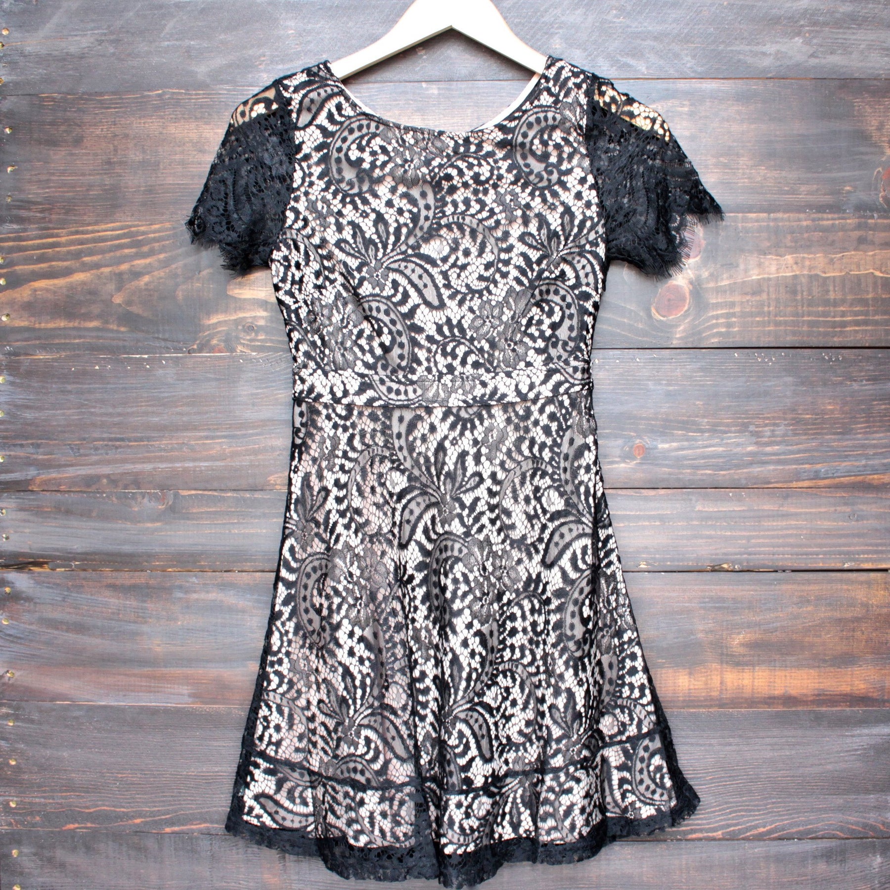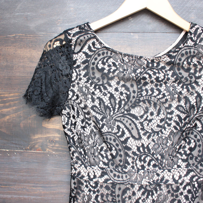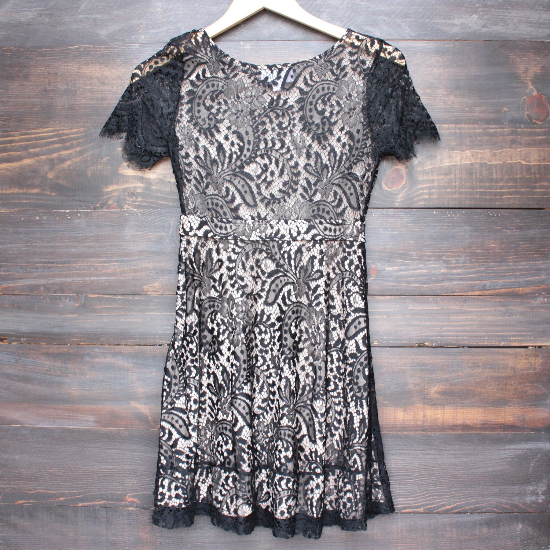 This gorgeous feminine fit and flare dress features an amazing black designed lace overlay and a nude base. Features a round boat neck, lacy short sleeves, a sheer yoke back and a round finished hem.