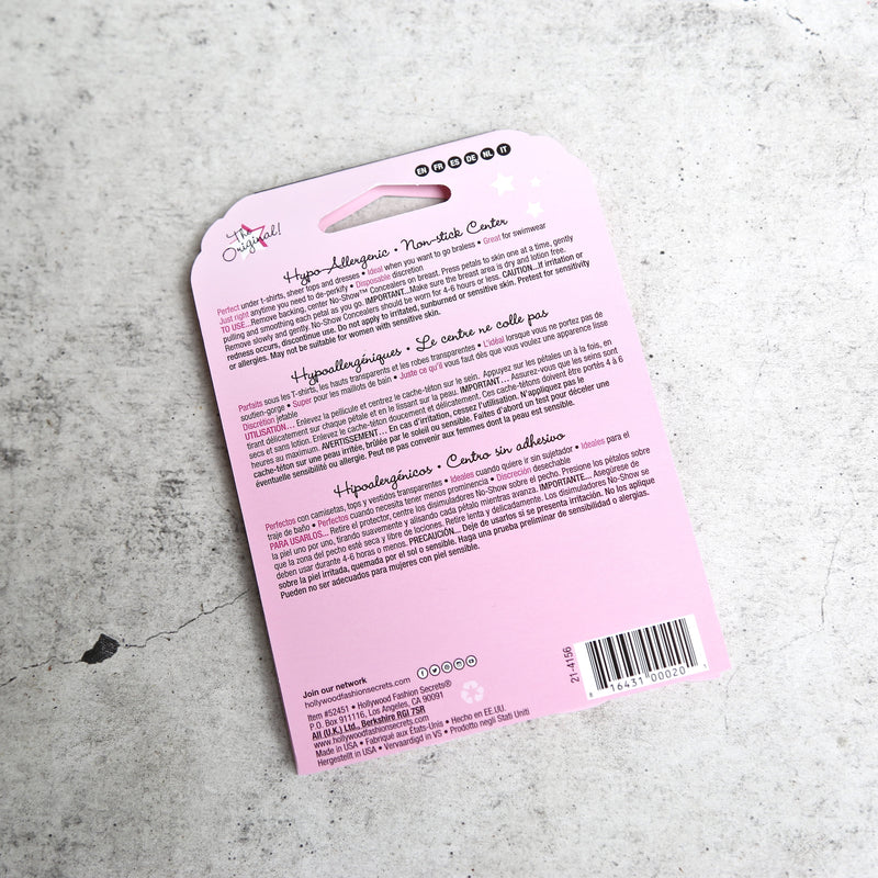 | How To Use | TO USE: Remove backing, center No-Show Concealers on breast. Press petals to skin one at a time, gently pulling and smoothing each petal as you go. IMPORTANT: Make sure the breast area is dry and lotion free. Remove slowly and gently. No-Show Concealers should be worn for 4-6 hours or less. CAUTION: If irritation or redness occurs, discontinue use. Do not apply to irritated, sunburned or sensitive skin. Pretest for sensitivity or allergies. May not be suitable for women with sensitive skin. |