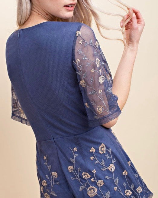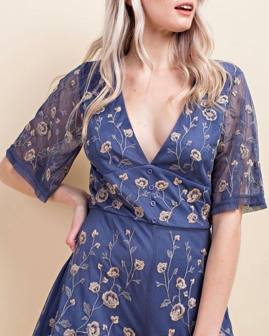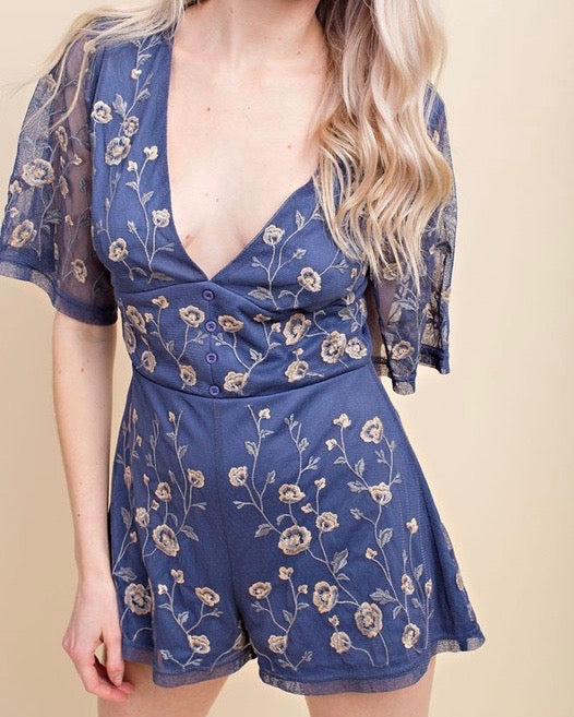 Honey Belle - V-Neck Floral Embroidered Short Sleeve Romper in Indigo