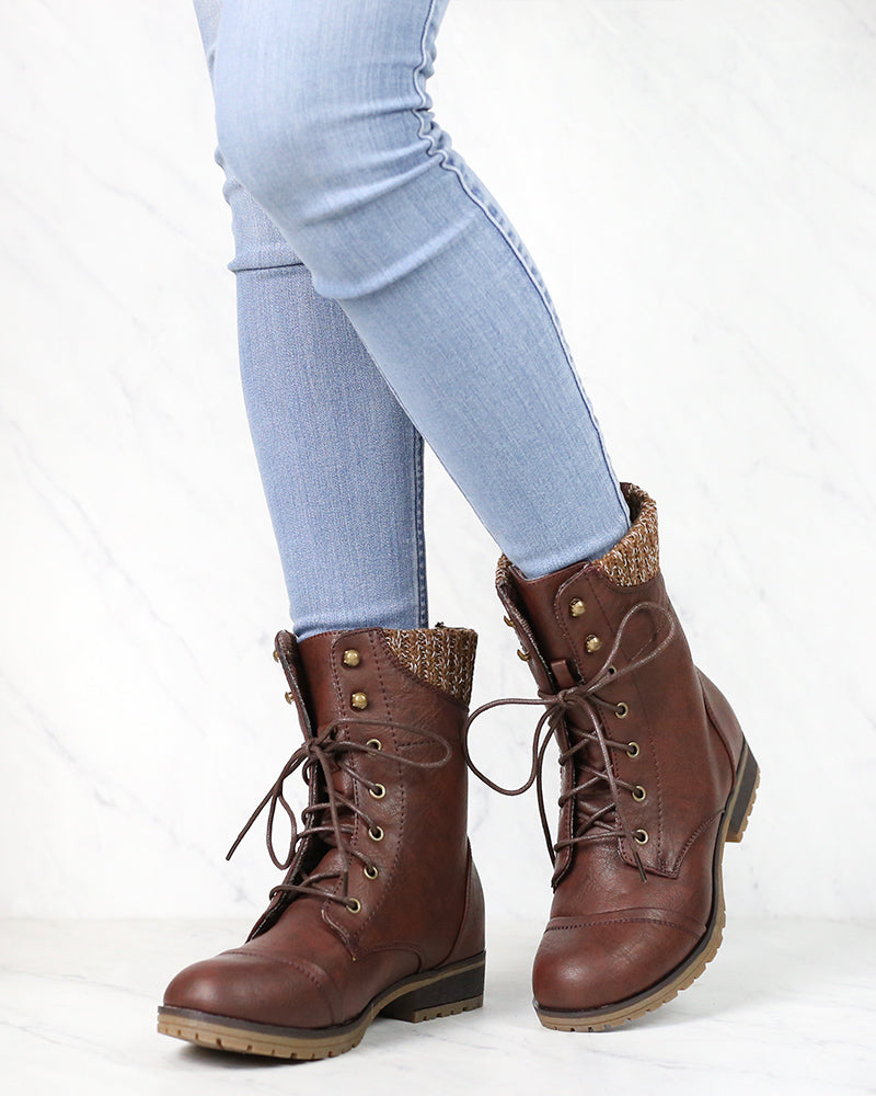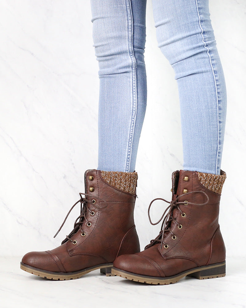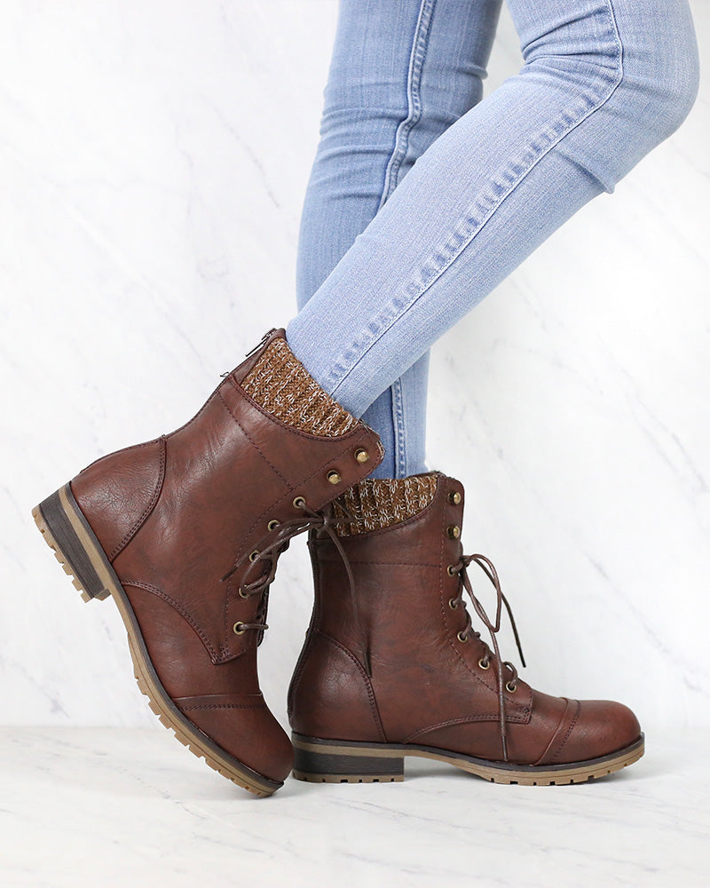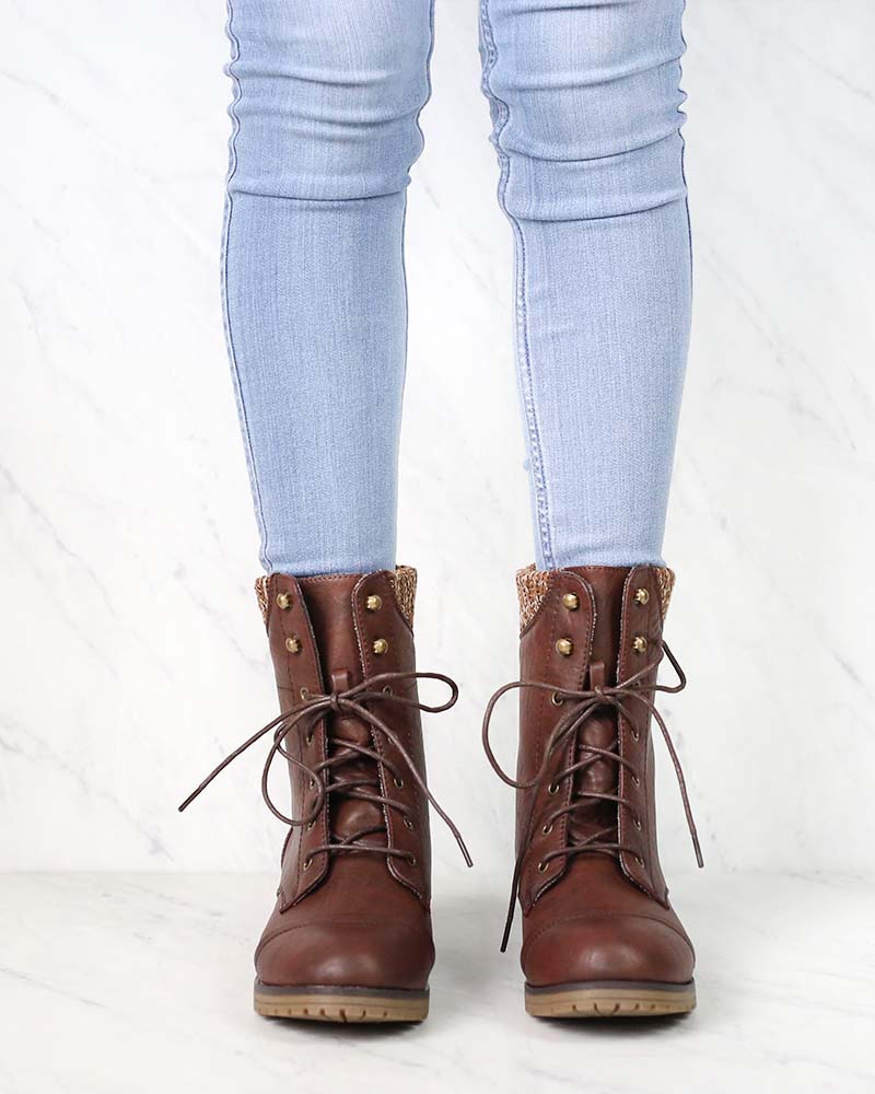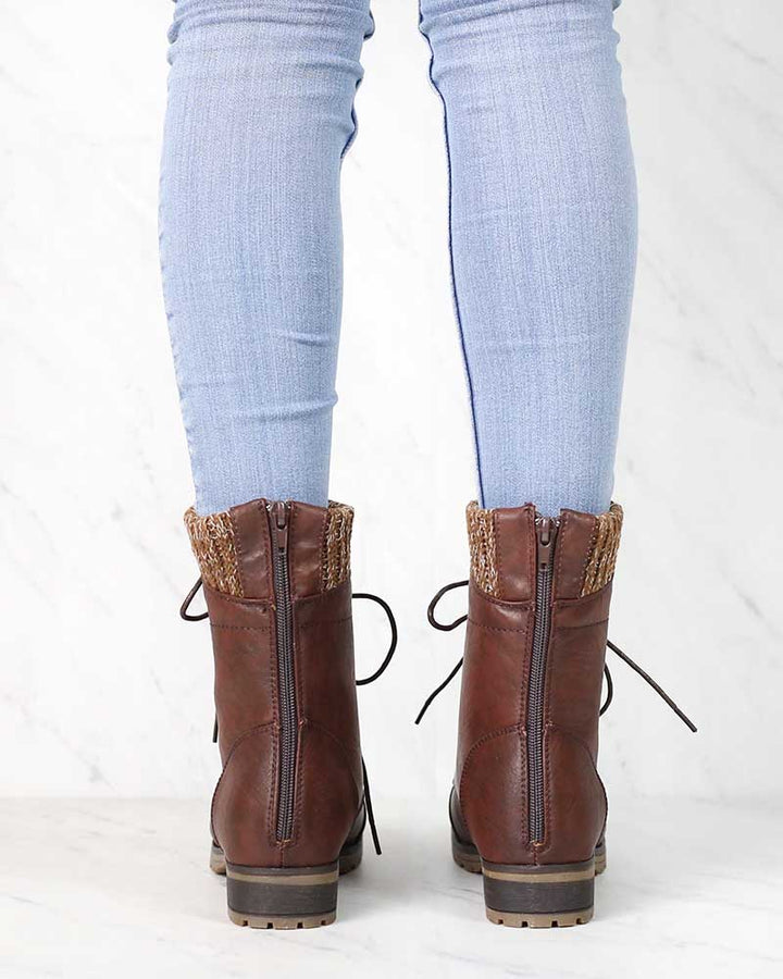 Rich taupe tones adorn this sweet mid calf length sweater boots. Features a laced up front, plaid inner linings, sweater cuff, zip up back closure, and treaded soles. Pair these boots with a sweater and distressed jeans for a perfect outfit in the fall!