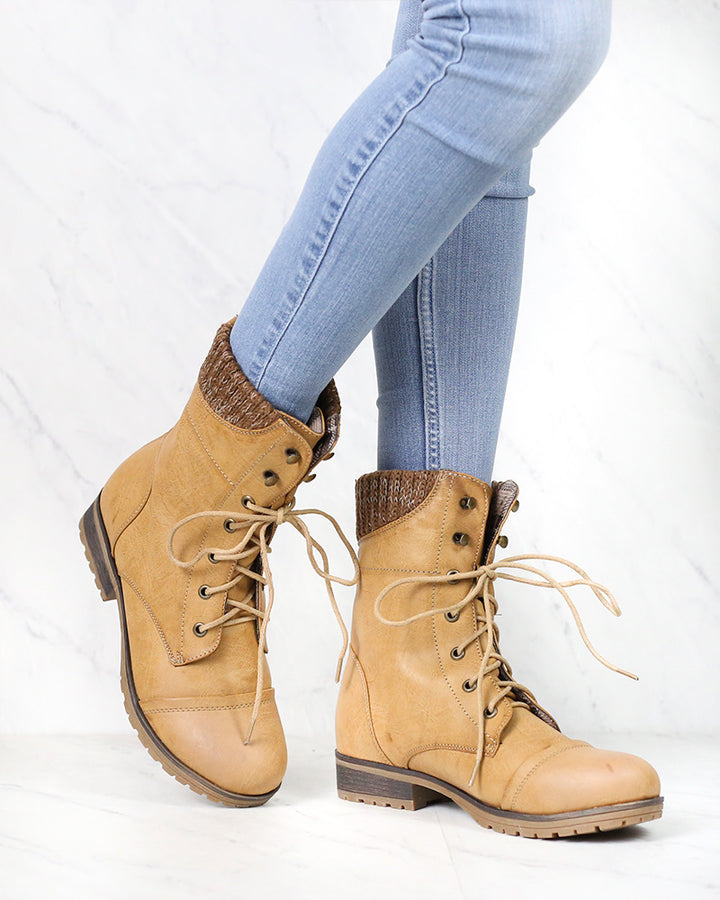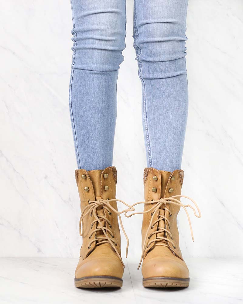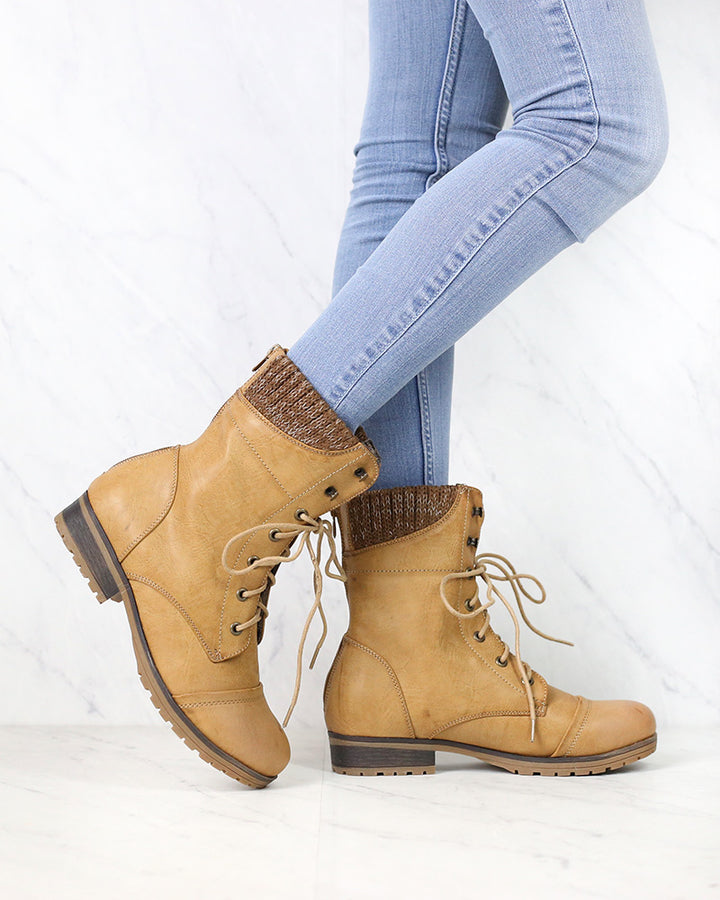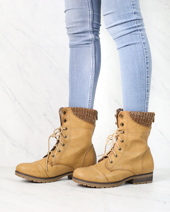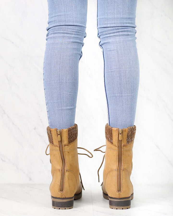 Rich taupe tones adorn this sweet mid calf length sweater boots. Features a laced up front, plaid inner linings, sweater cuff, zip up back closure, and treaded soles. Pair these boots with a sweater and distressed jeans for a perfect outfit in the fall!