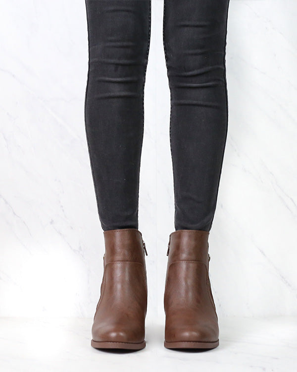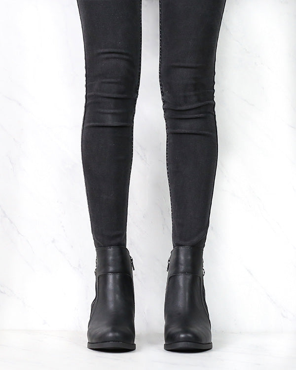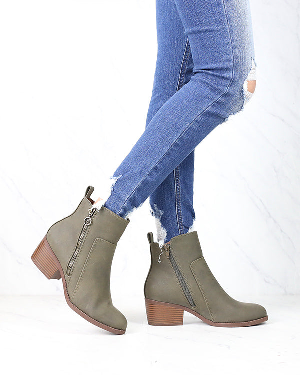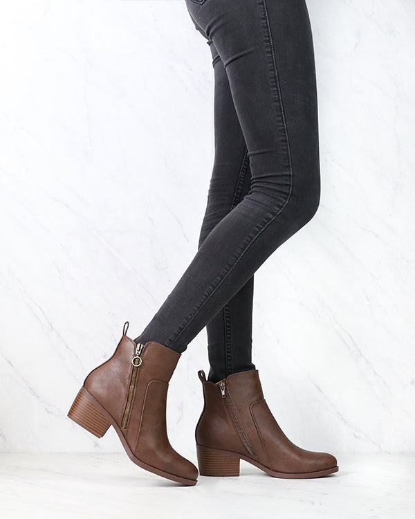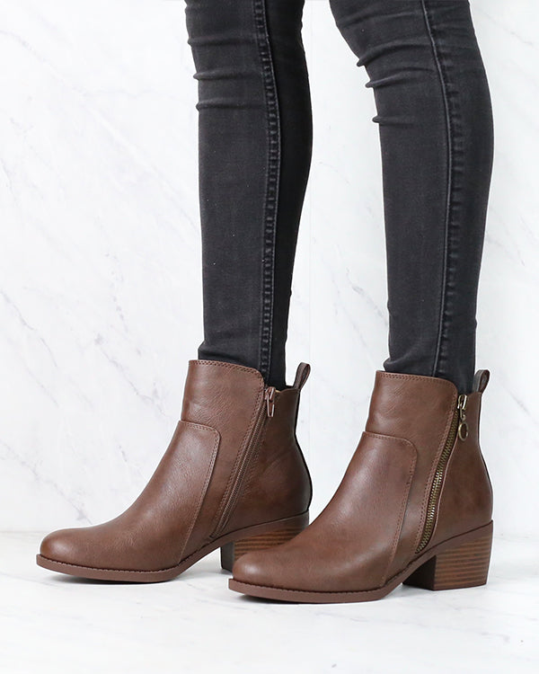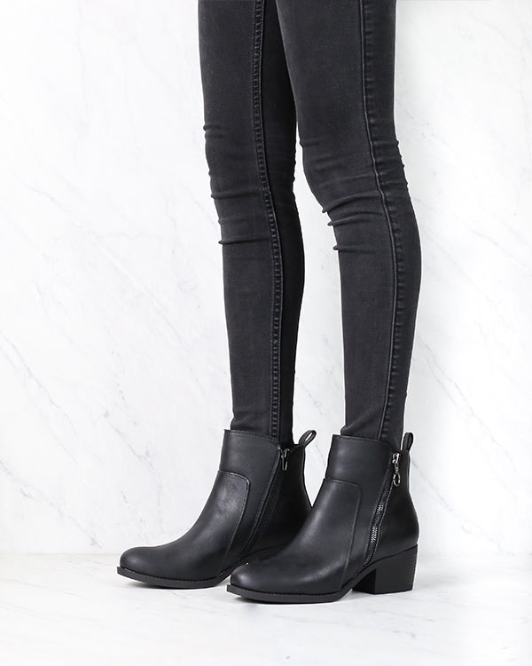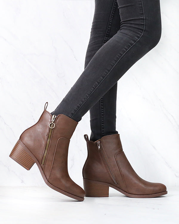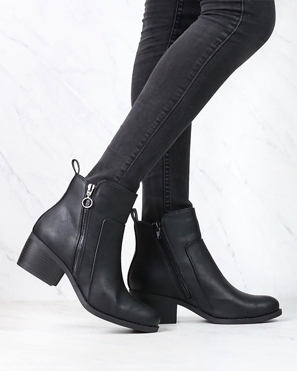 Make room in your closet for some new fall booties! These booties are versatile for any and all occasions, especially for the fall or winter. Highlighting the boot's faux leather finish, they also feature an outer zipper with a circular pull tab, stitching detail across the front, an inner zipper for convenient entry, and a 1.75" stacked heel. The perfect fall outfit would include these booties as a finishing touch to your outfit of a lightweight, off the shoulder sweater and some distressed jeans.