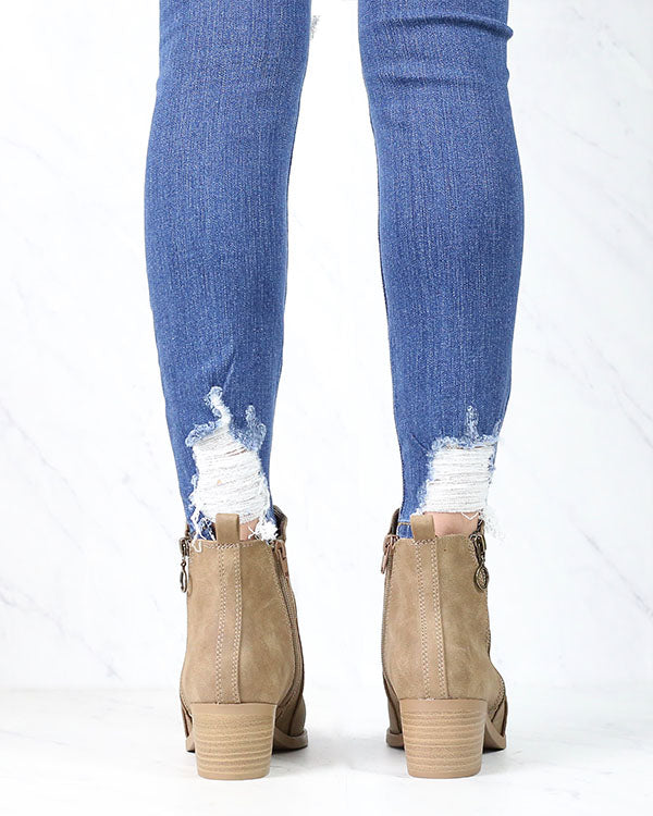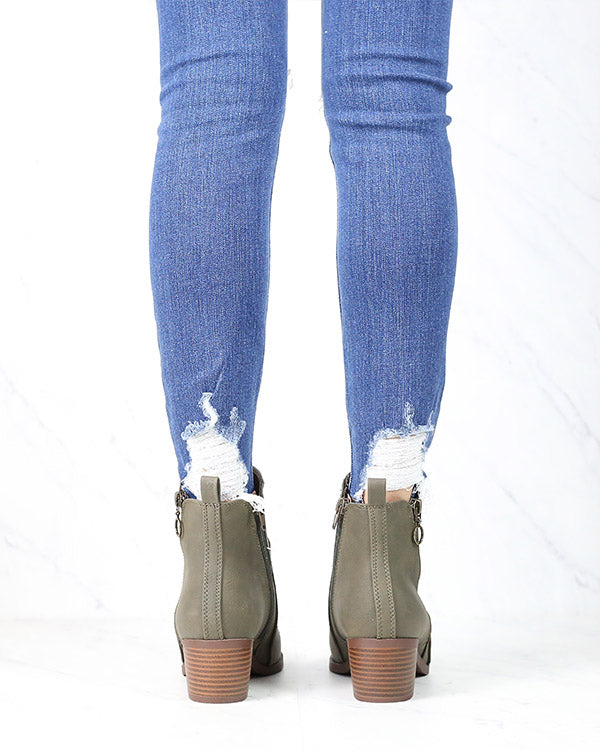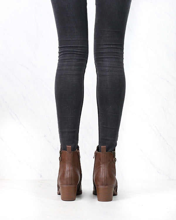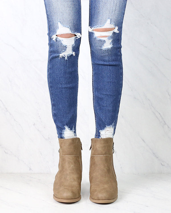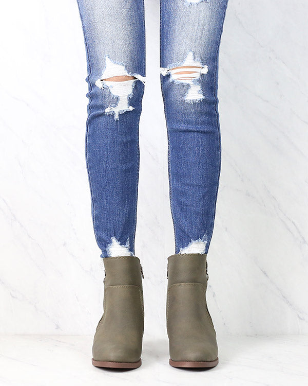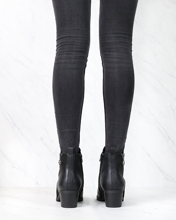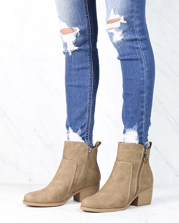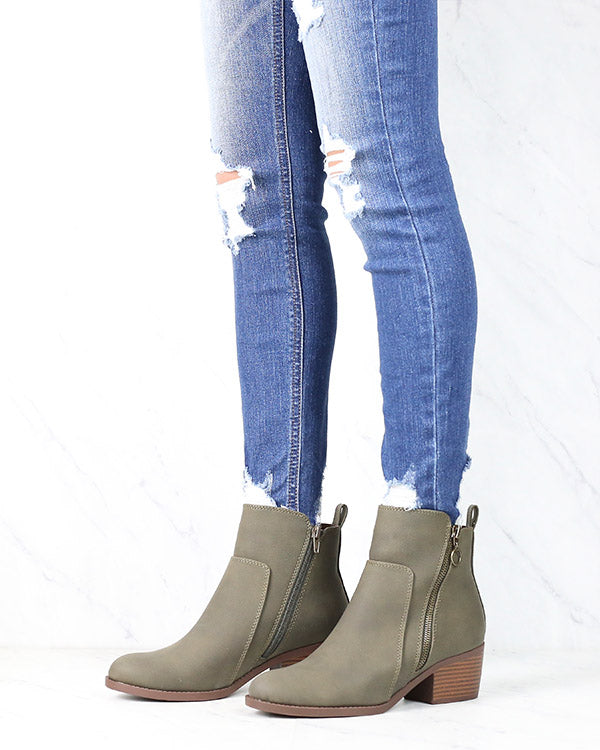 Make room in your closet for some new fall booties! These booties are versatile for any and all occasions, especially for the fall or winter. Highlighting the boot's faux leather finish, they also feature an outer zipper with a circular pull tab, stitching detail across the front, an inner zipper for convenient entry, and a 1.75" stacked heel. The perfect fall outfit would include these booties as a finishing touch to your outfit of a lightweight, off the shoulder sweater and some distressed jeans.