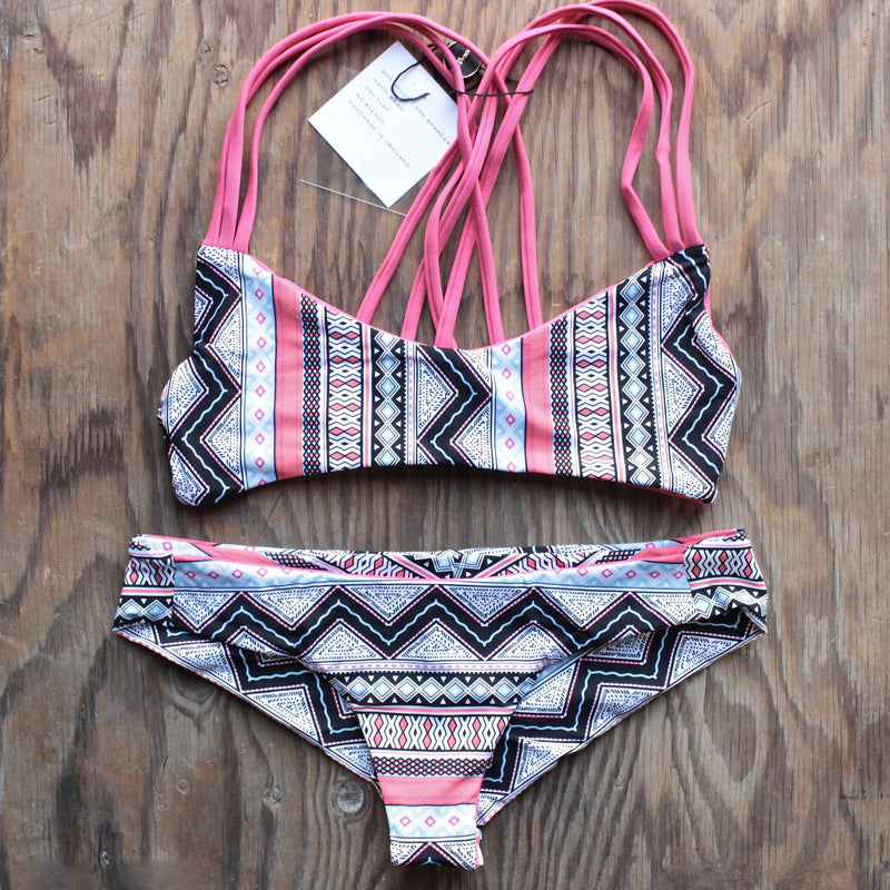 Handmade full-cut bottom providing a full behind coverage, it is matched with a Reversible Criss-Cross styled top. The elastic straps in the top offer a perfect bust fit. Both top and bottom are reversible.