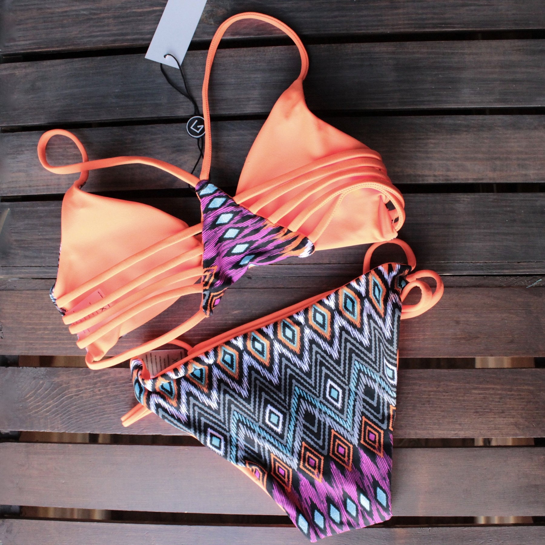 The reversible bottom comes in a full-cut design and ties on each hip side which can be adjusted to create a perfect fit just for you. Reversible design in one print and one solid side.