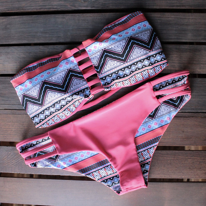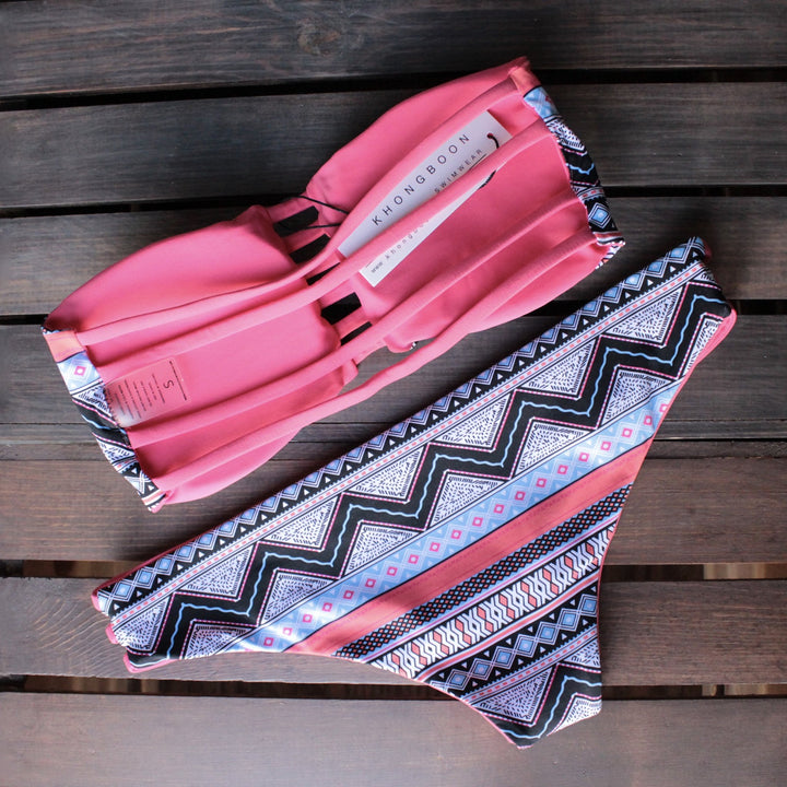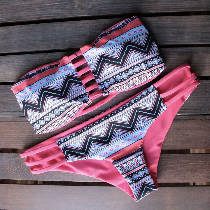 Handmade Two-Piece Bikini with Reversible Full-Cut Bottom & Reversible Bandeau Strap Top with elastic straps at back for perfect fit. 4 in 1 design with 4 different wearing options within the same bikini.