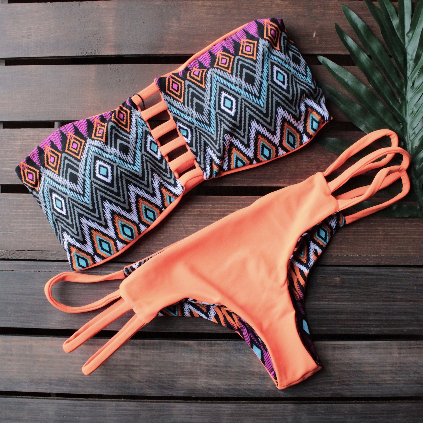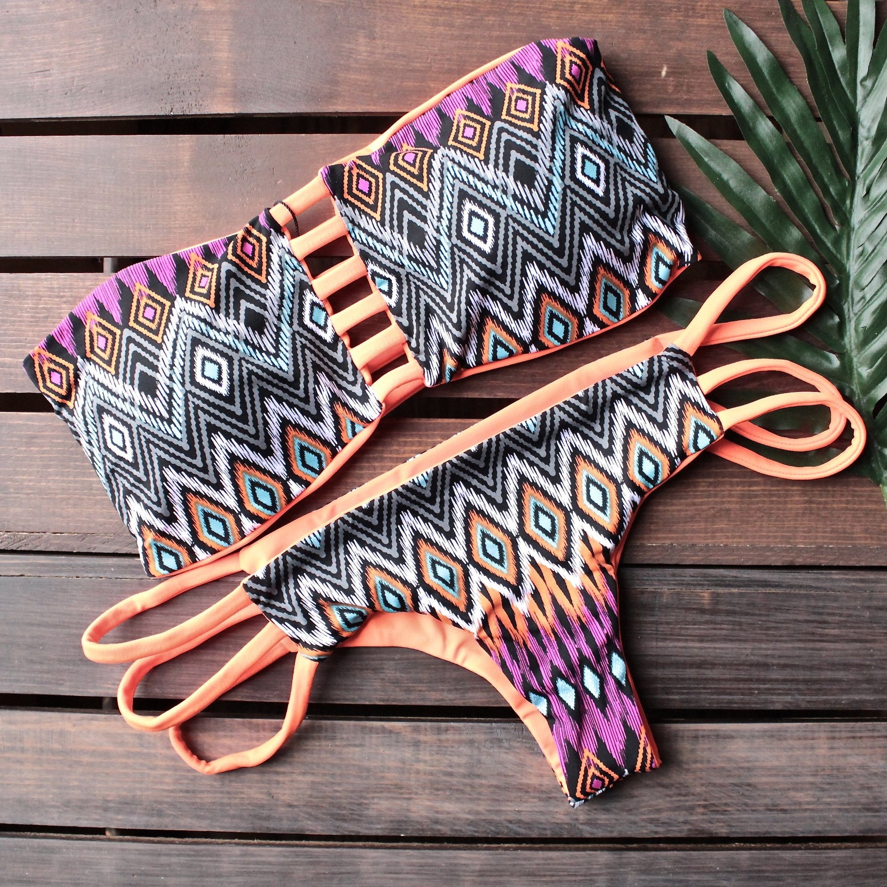 Handmade Two-Piece Bikini with Reversible Brazilian-Cut Bottom & Reversible Bandeau Strap Top with elastic straps at back for perfect fit. 4 in 1 design with 4 different wearing options within the same bikini.