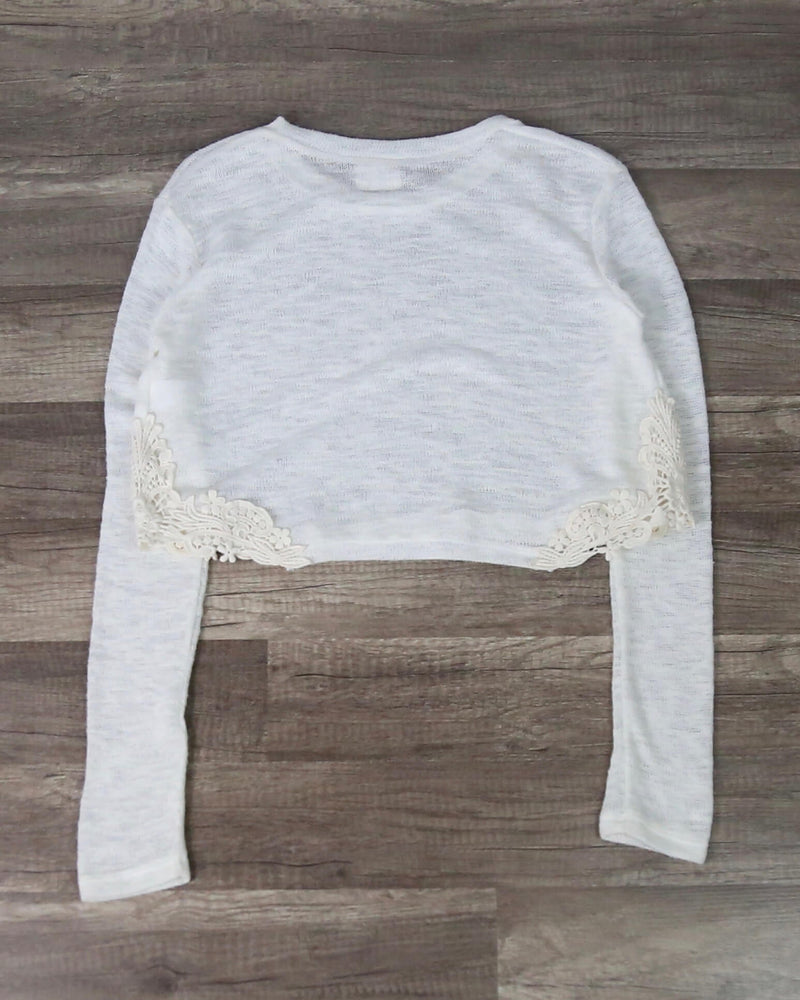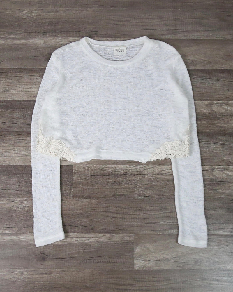 A super cute and basic top that can be thrown on to layer up for this fall and winter season! This cropped sweater features a lace embroidered detail on the hem.