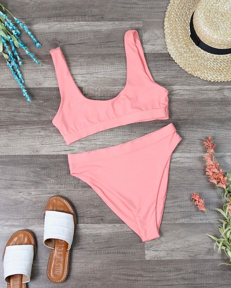 Dippin' Daisy's Sporty Banded Top High Waisted Cheeky Bottom Bikini Separates in Coral