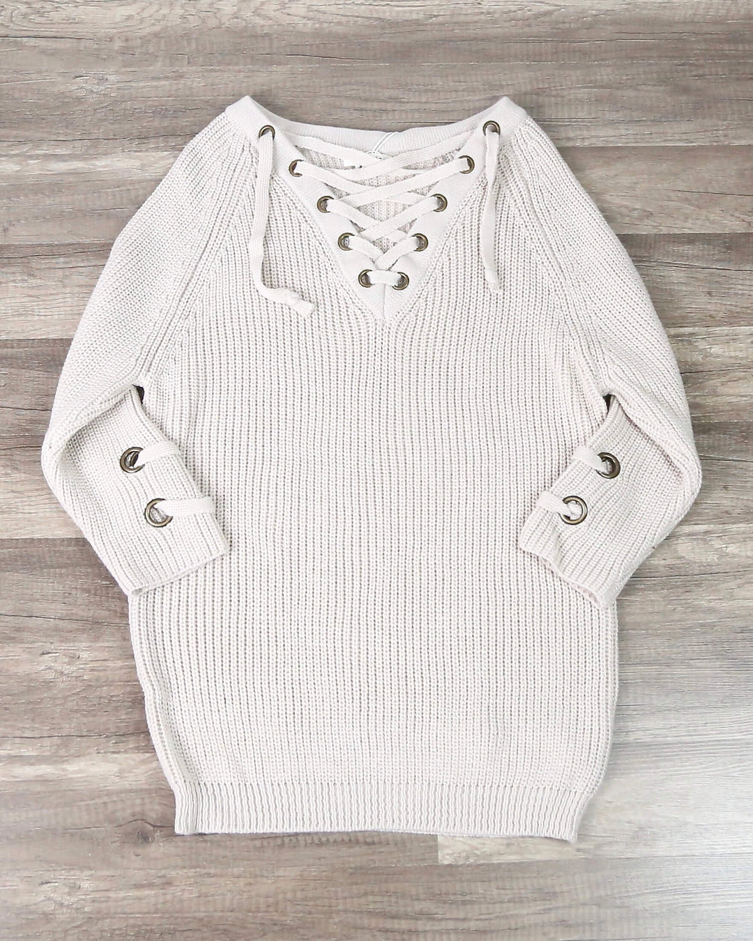 Sweaters are always needed, especially for the fall! This sweater features a lace up neckline with grommet details and the same detailing at the bottom of the sleeves. The length is perfect to wear over a pair of leggings or as a dress and pairing it with some cute booties!