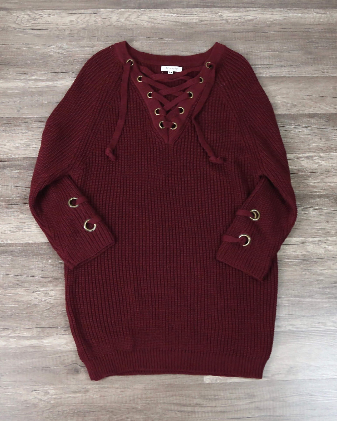 Sweaters are always needed, especially for the fall! This sweater features a lace up neckline with grommet details and the same detailing at the bottom of the sleeves. The length is perfect to wear over a pair of leggings or as a dress and pairing it with some cute booties!