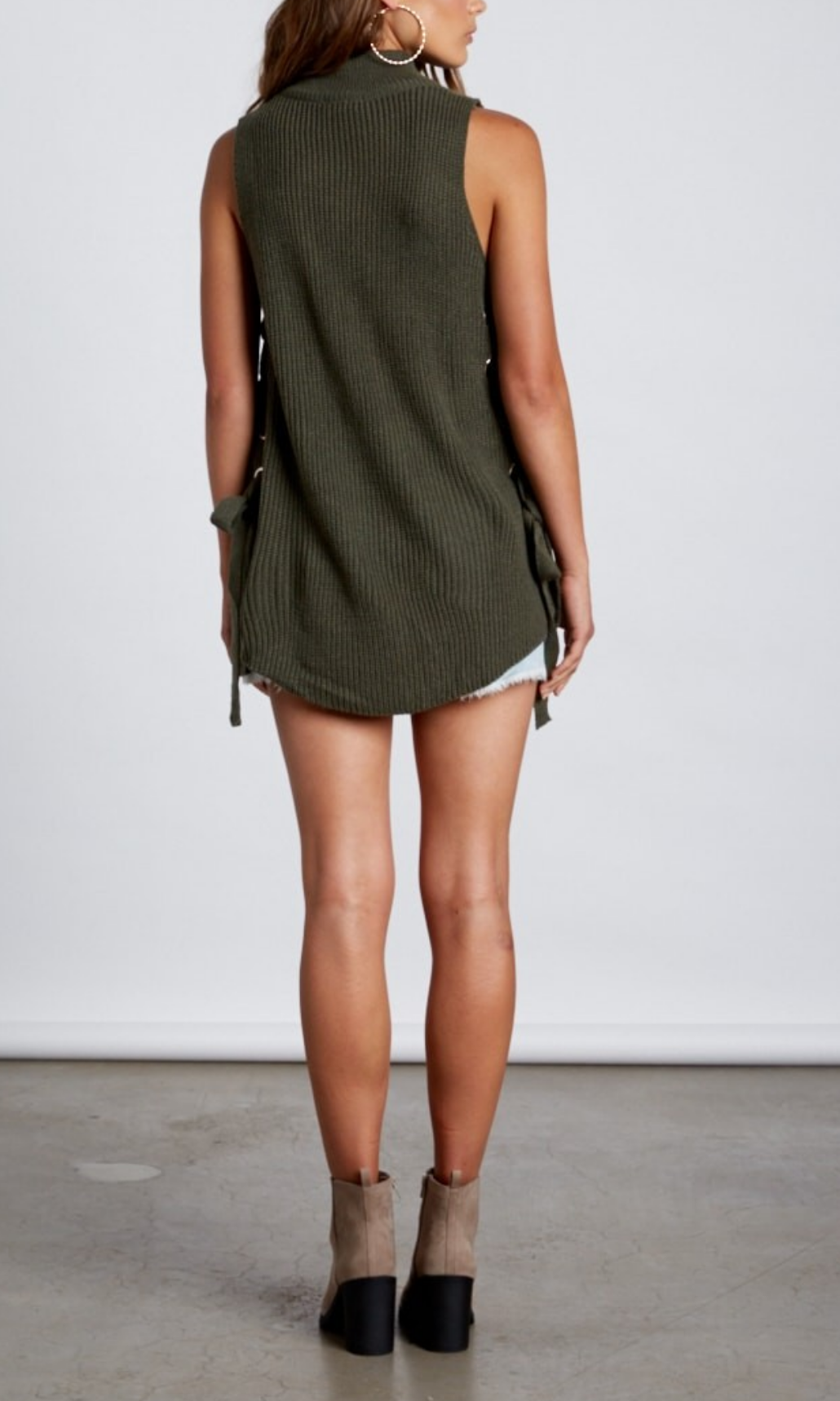 Sleeveless sweater featuring key hole at front and lace-up detail on the sides. Imported.