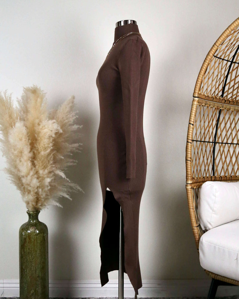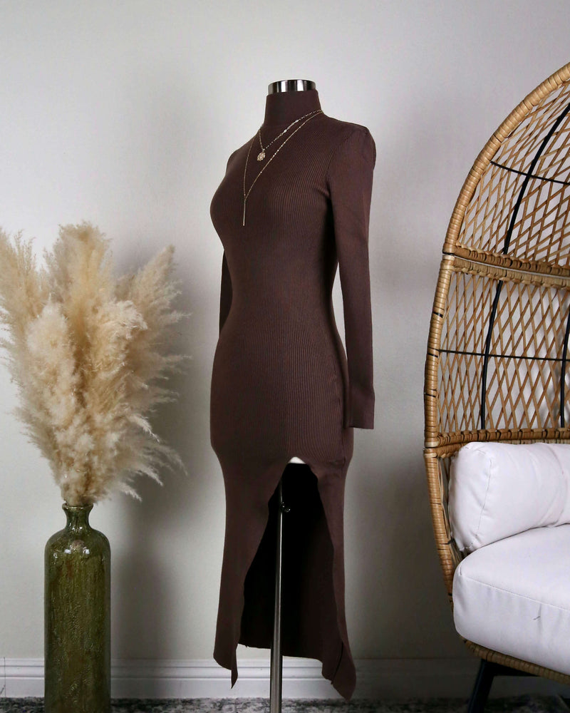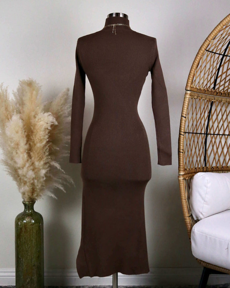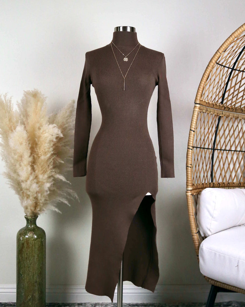 mock neck - midi dress - knit - sweater dress - long sleeve - ribbed - bodycon - side slit - brown