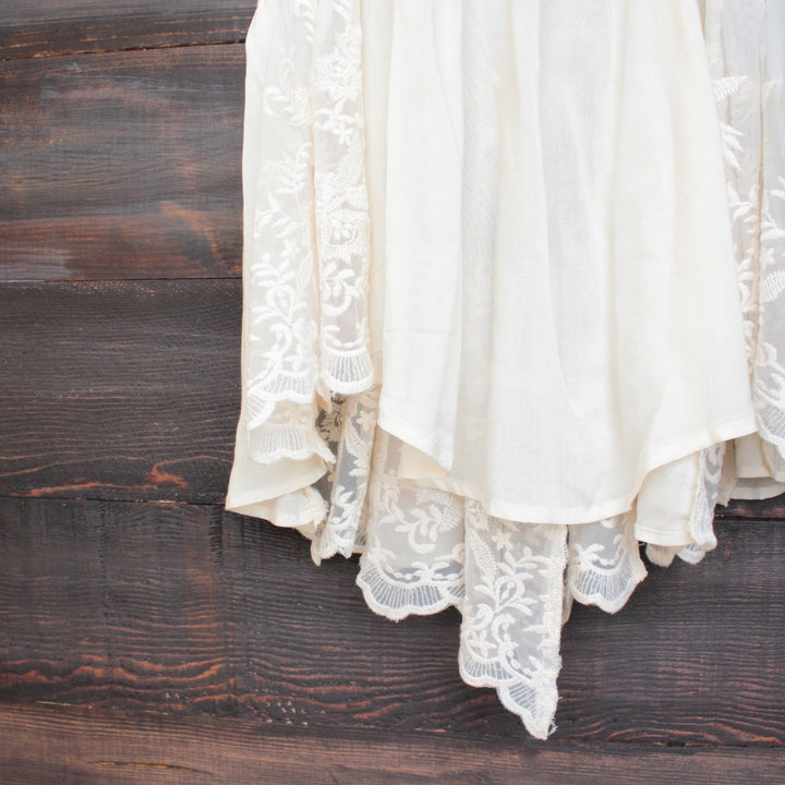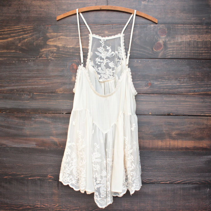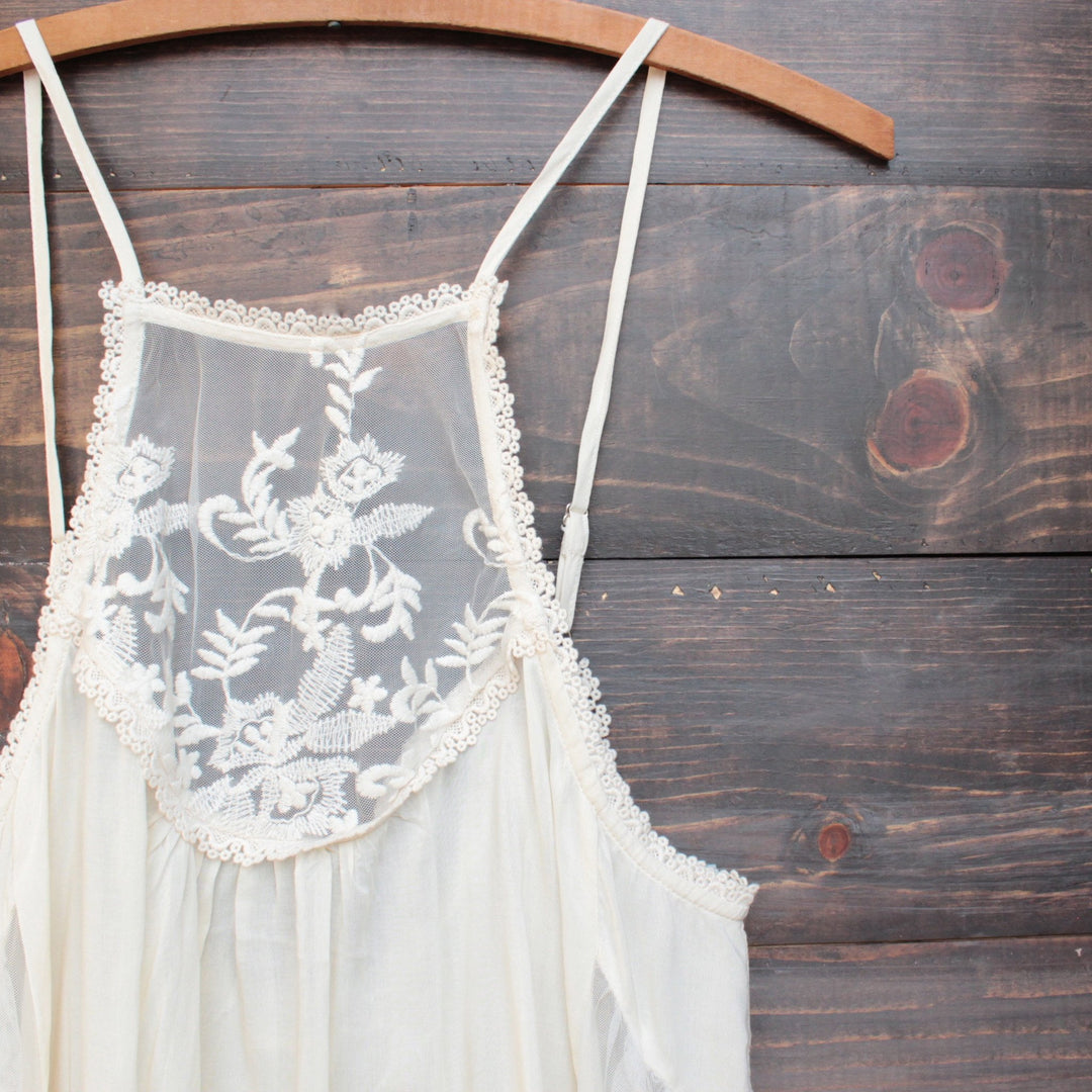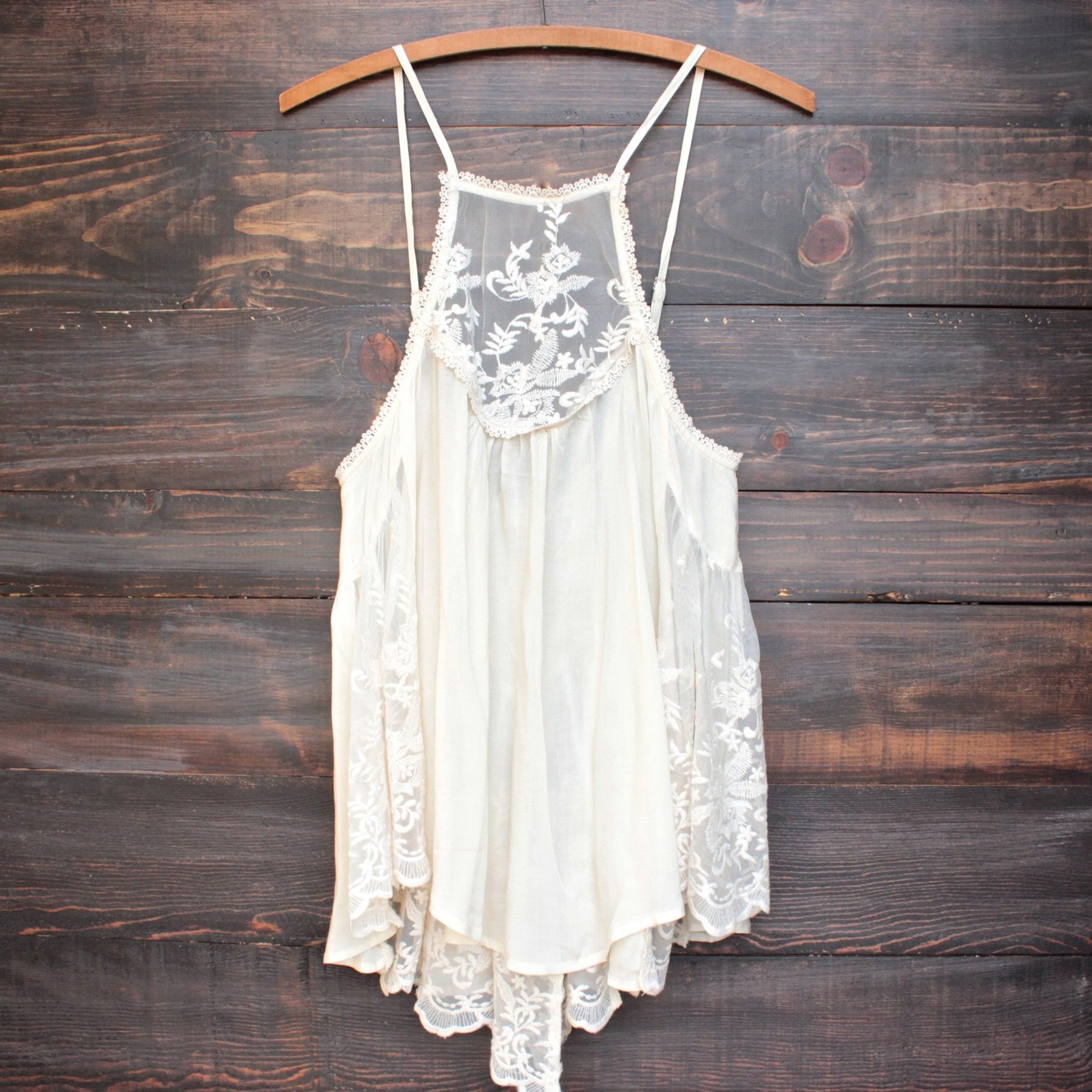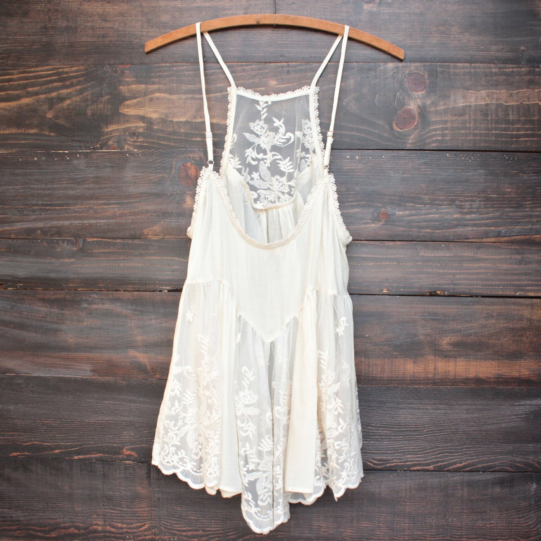 Cute! Light and flowy! Areas of lace and somewhat sheer but not too revealing. It doesn’t run big but is meant to fit flowy, so keep that in mind. Cute with a cream colored bralette. Longer in back.