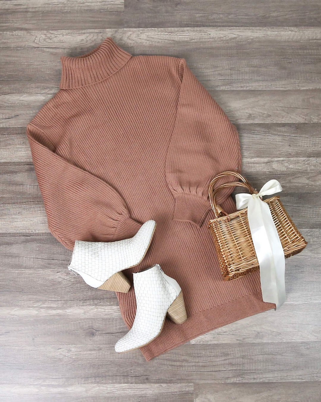 This sweater knit dress is perfect for those chilly winter days. Featuring bishop sleeves and a turtle neckline, you definitely don't want to miss out on this dress. Pair this gorgeous dress with your favorite pair of ankle booties for the cutest winter outfit!