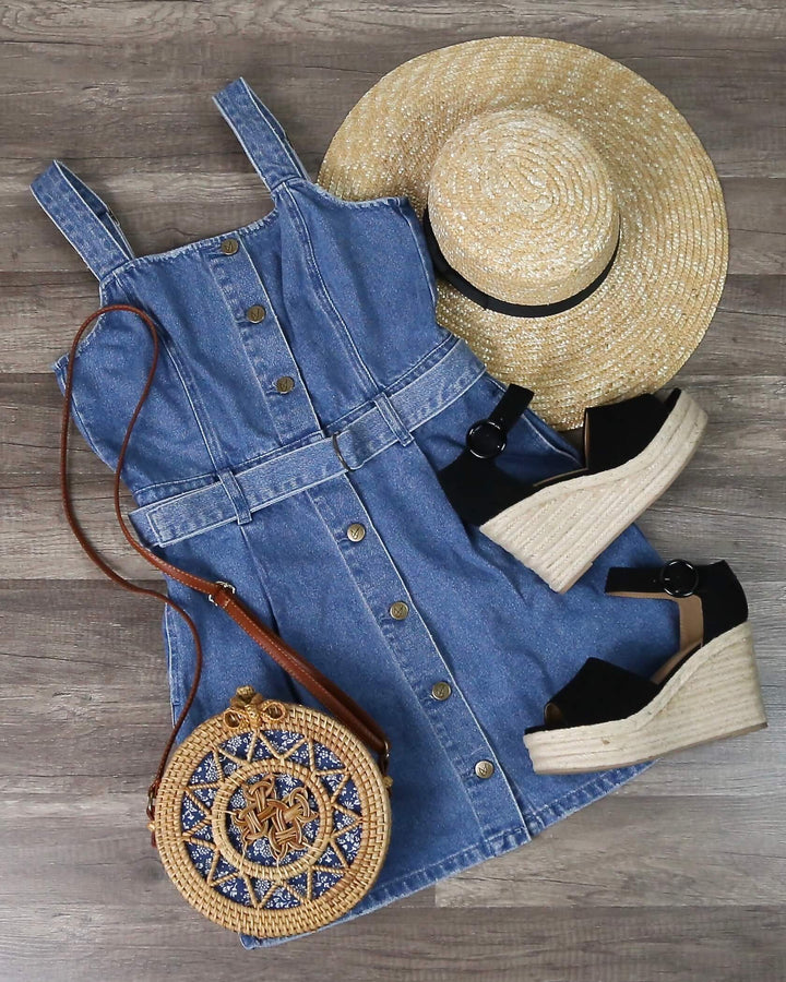 Create the perfect sightseeing outfit with the MINKPINK Andy Denim Button-Front Belted Mini Dress, a mini backpack, and some cute sunnies! Sturdy denim shapes a square neckline and adjustable shoulder straps with brass hardware. A branded brass button placket travels down the seamed bodice atop a banded waist (with belt loops and a removable sash belt with a D-ring buckle) to the A-line silhouette and ends at the mini hem. Two diagonal pockets.