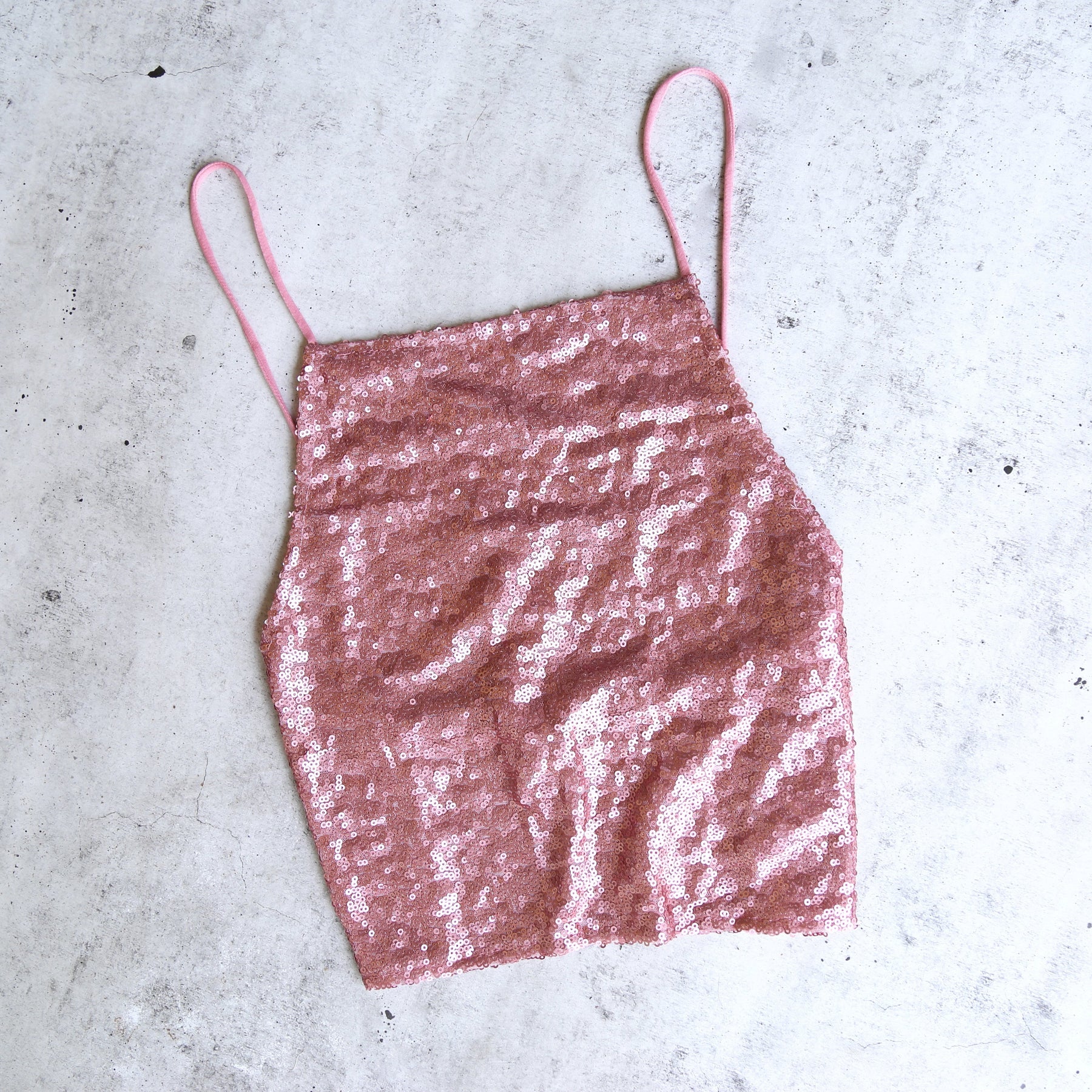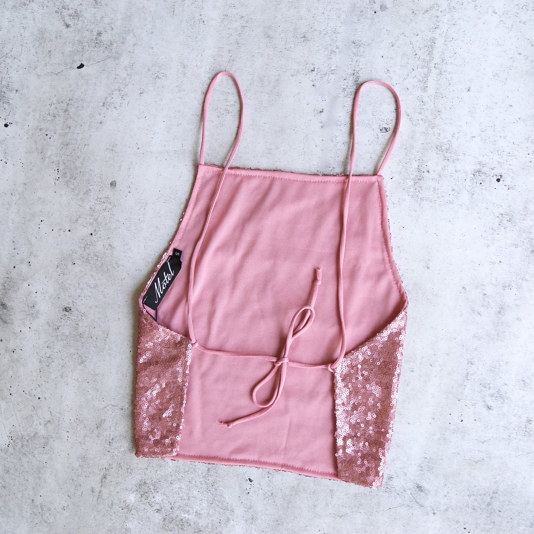 Add some sparkle to a trending fave and up your sass game! In a sugar pink sequin, the Athena top features a cropped length, halter neck with backless fit and spaghetti strap detailing. Style with your fave denim, chunky platforms and sleek braids - perfect for festival season!