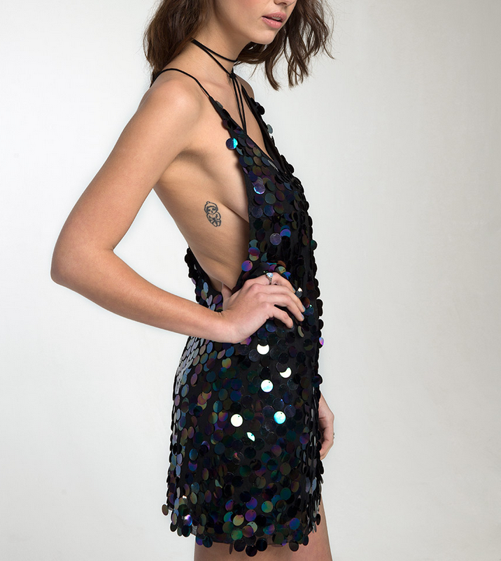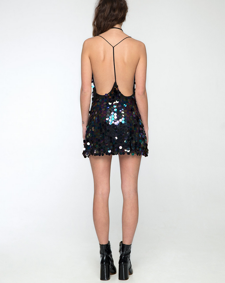 Channel some major disco vibes in this showstopping slip dress in our unique oversized iridescent multi-colored sequins, a deep V neck line with thin strap detailing to the back. Work the dance floor this party season by pairing this with a pair of killer heels and sleek sultry hair.