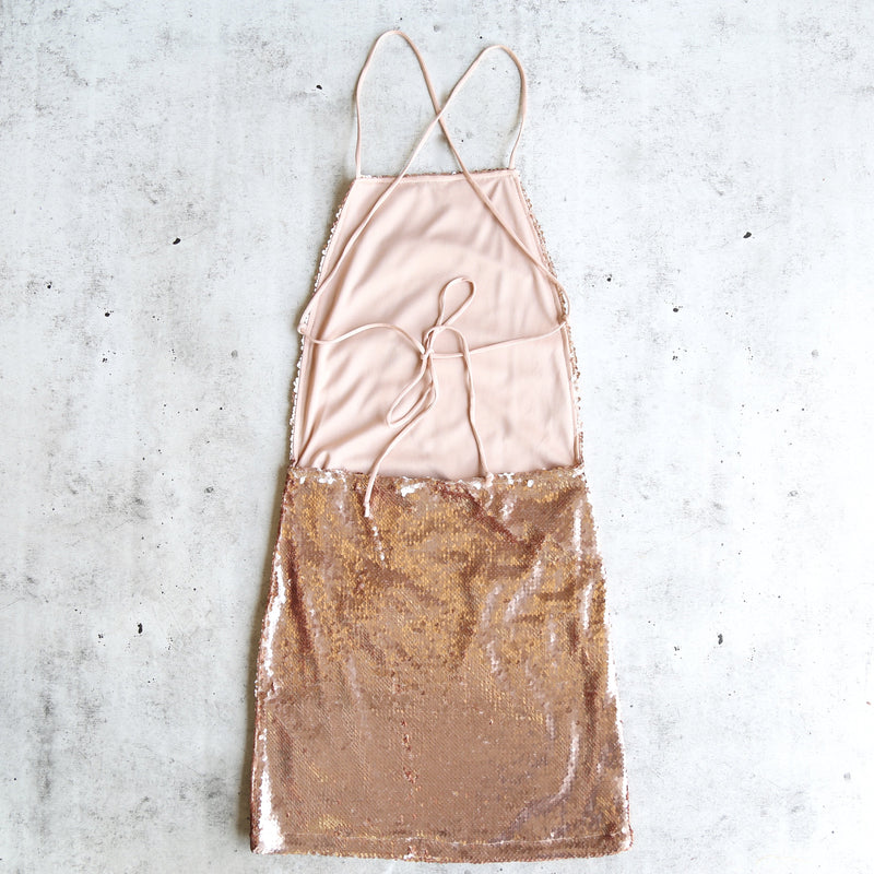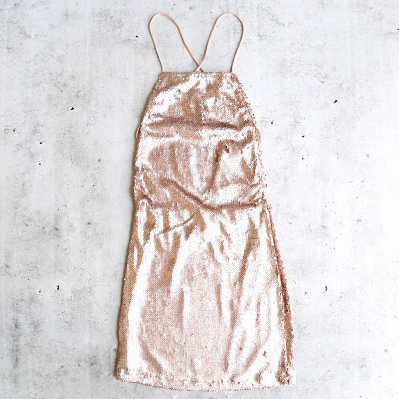 The Muse dress comes in our favorite party embellishment the statement sequin. In a luxurious champagne sequin this mini dress features a bodycon fit with halter neck, open back and spaghetti strap detailing. Finish off this party look with a black court shoe and sleek hair.