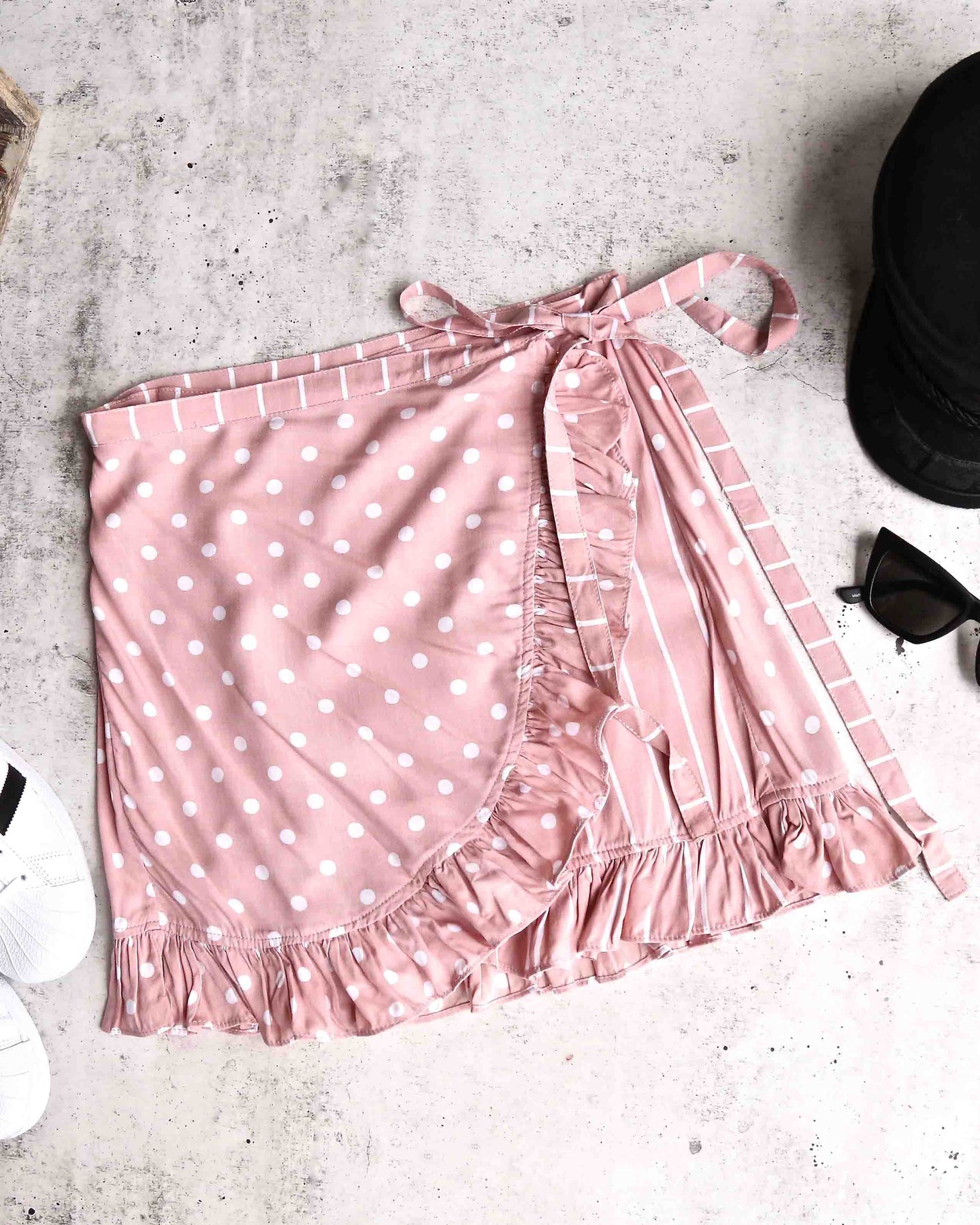 our Miza skirt features a high waist mini fit with wrap around front and cute side tie detailing.