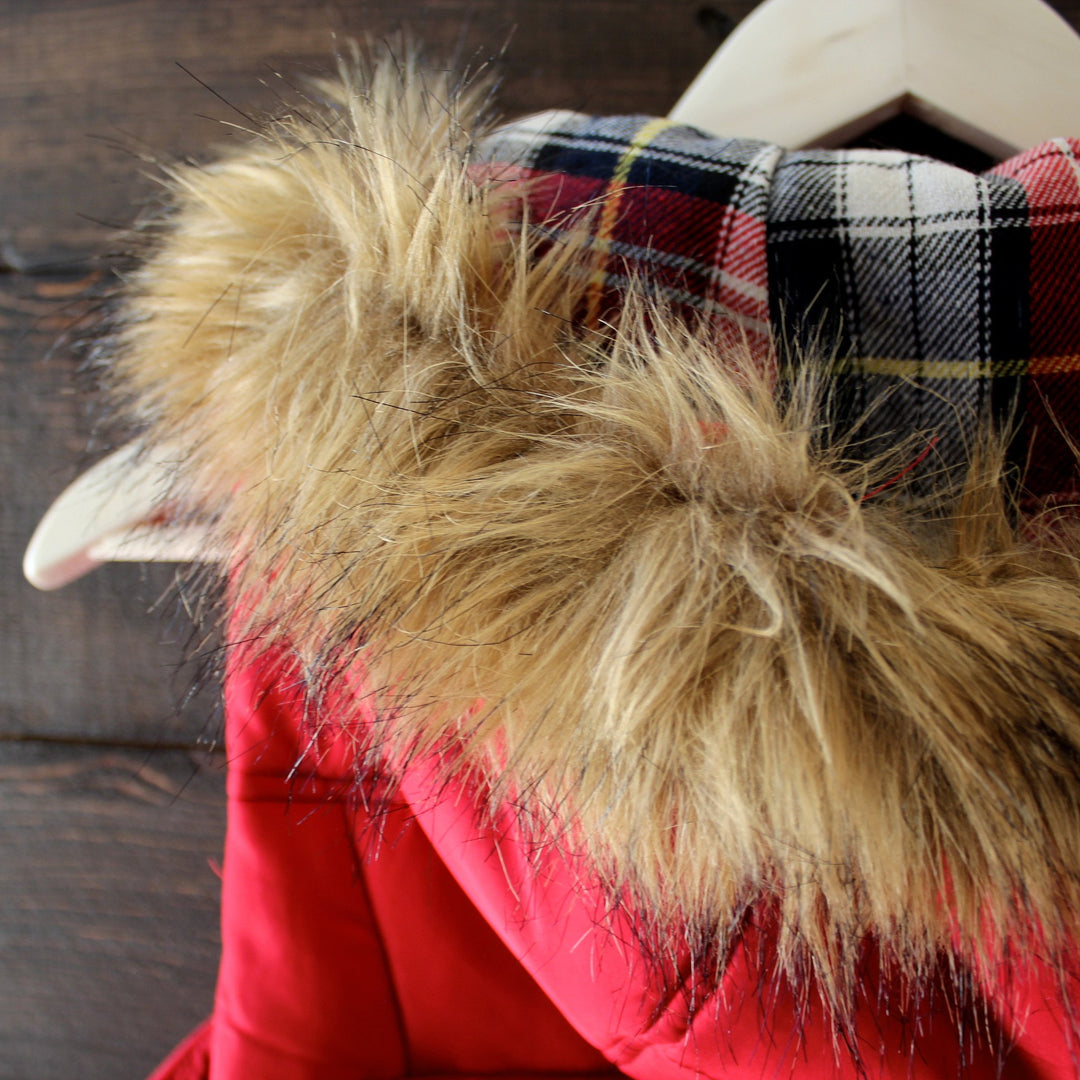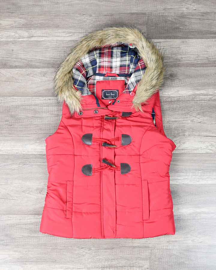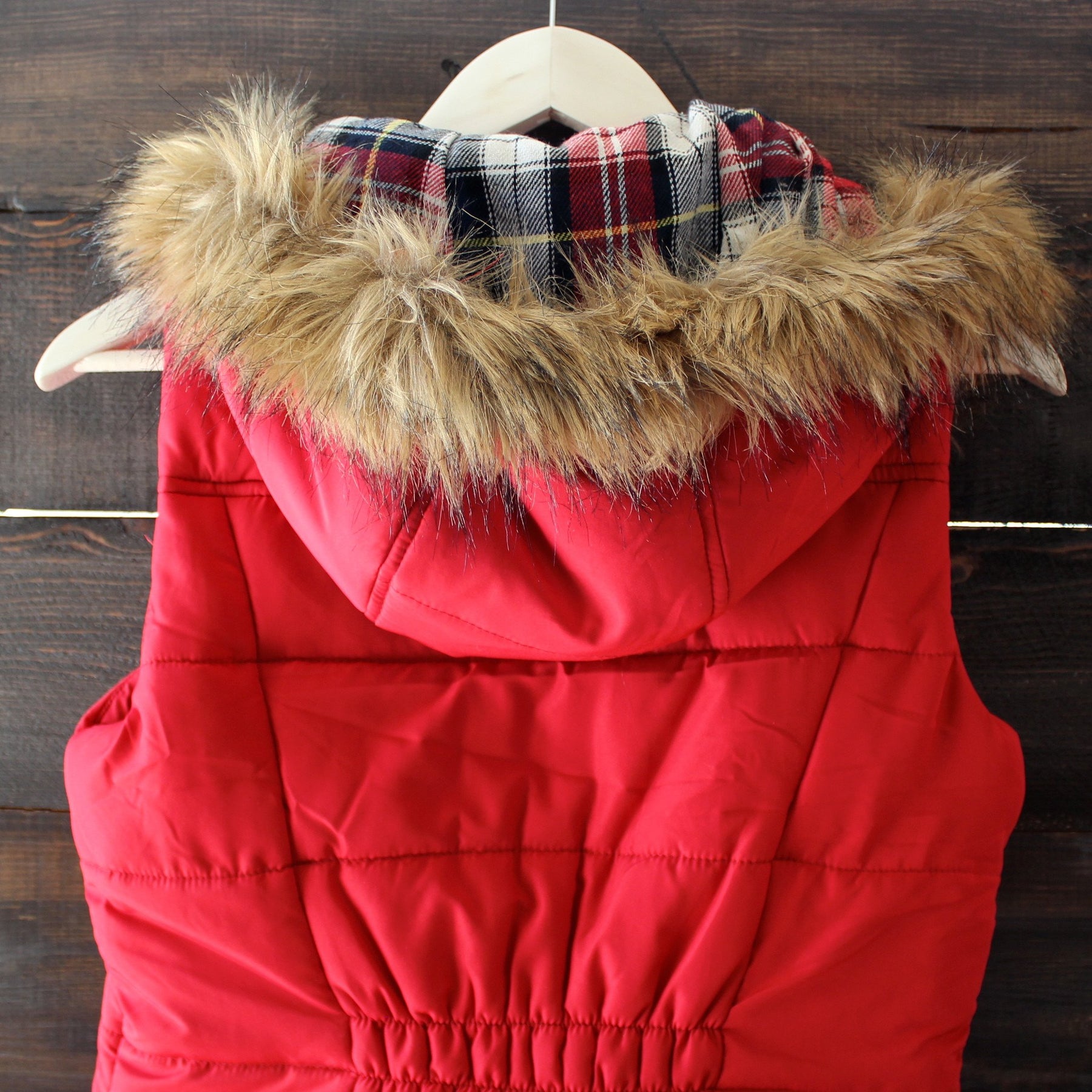 The perfect layering piece for the snow! This rich black toned puffer vest, featuring a contrasting plaid lining and removable hood fur outer lining, is guaranteed to keep you warm this winter. Pair this vest over a thermal, jeggings, and your favorite pair of booties.