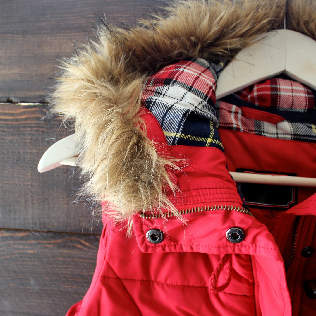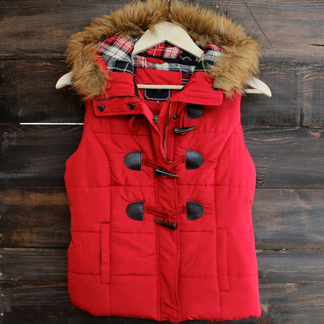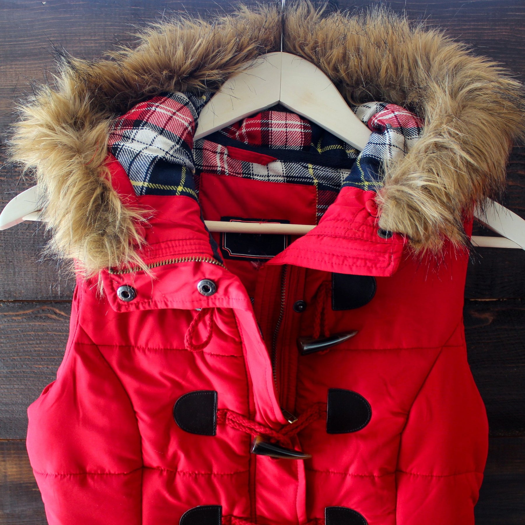 The perfect layering piece for the snow! This rich black toned puffer vest, featuring a contrasting plaid lining and removable hood fur outer lining, is guaranteed to keep you warm this winter. Pair this vest over a thermal, jeggings, and your favorite pair of booties.