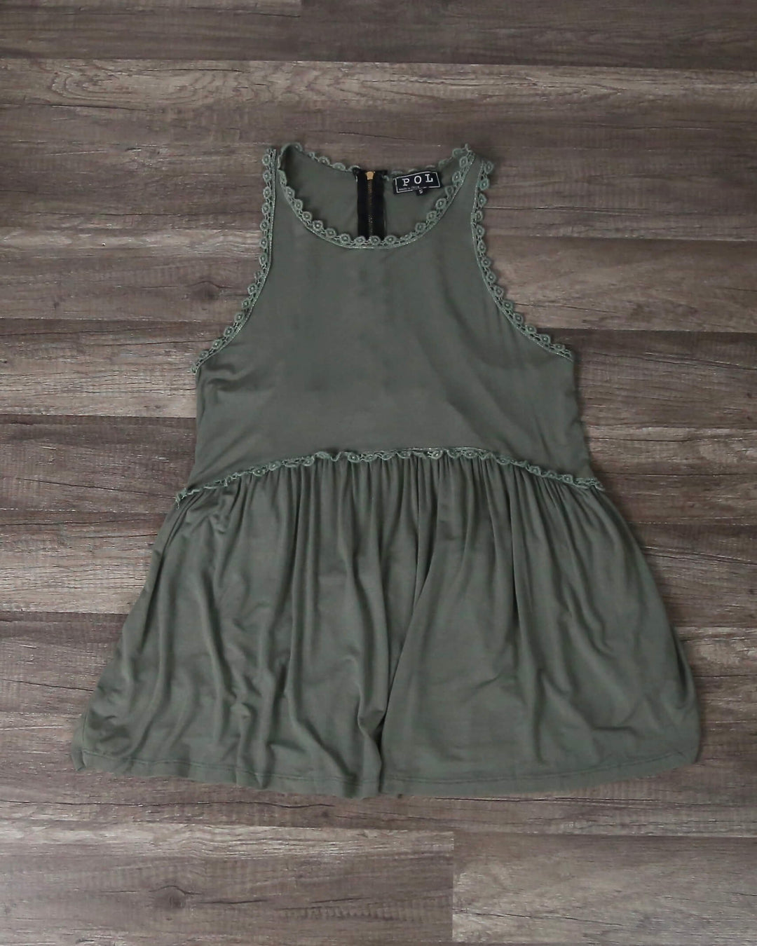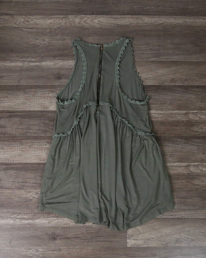 This crazy cool, cozy, and super-soft olive green cotton blend top features an acid wash finish, crochet trim neckline and under-bust, a racer back design and exposed back zip. Pairs perfectly with distressed denim, cut out ankle booties, and a latte.