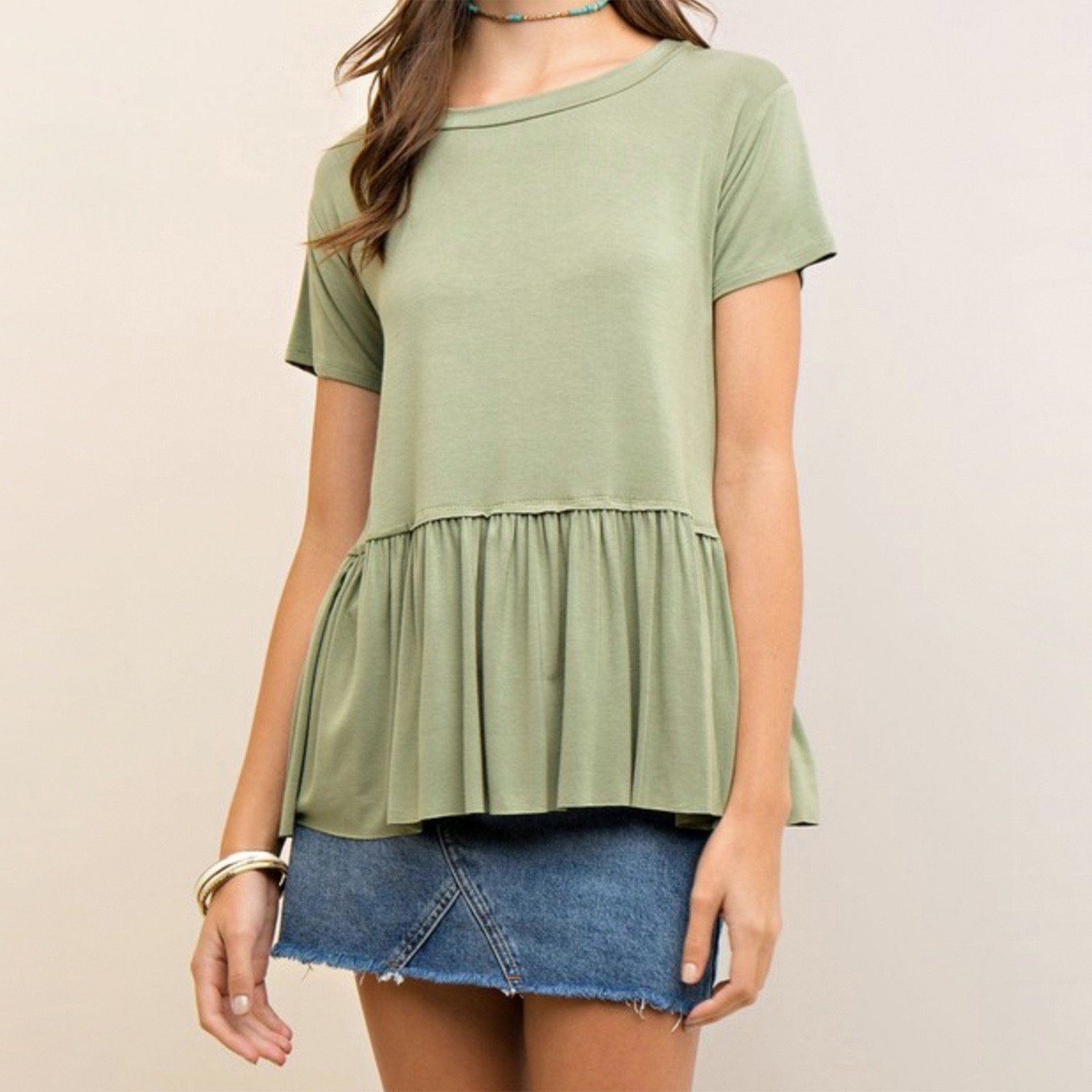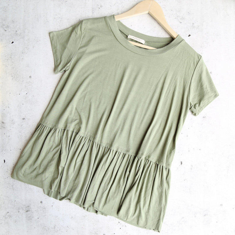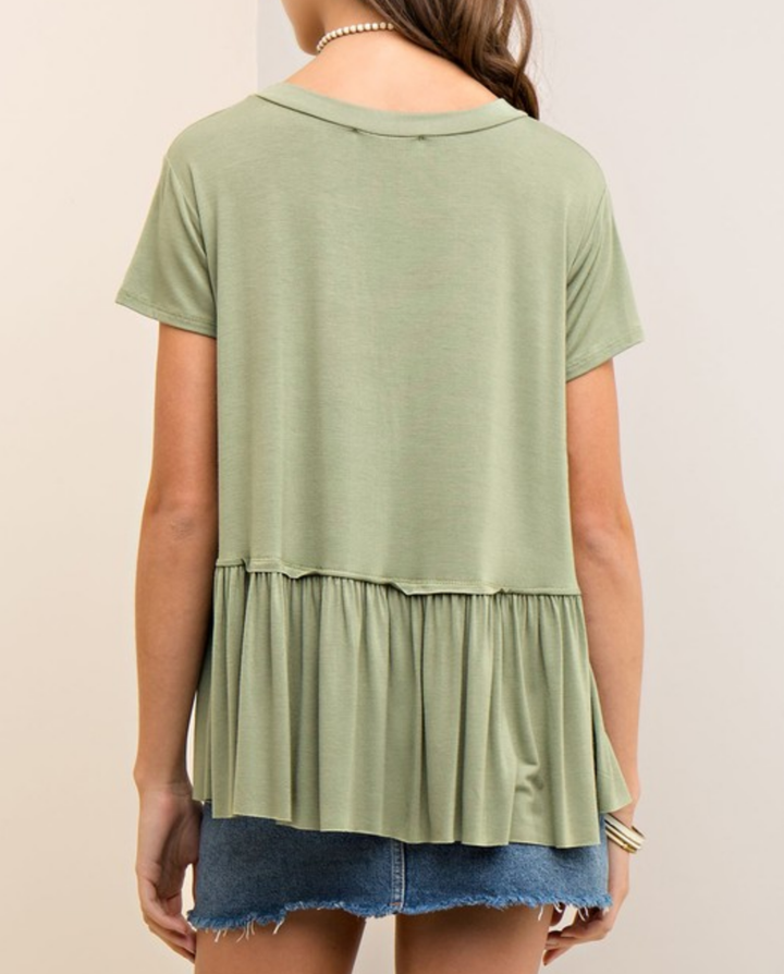 Solid crew neck Tee featuring tiered detail at waist. Non-sheer. Knit. Lightweight. 96%BAMBOO 4%SPANDEX