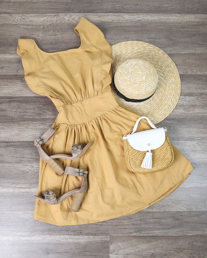 Super cute bow back fit-n-flare mini dress in a summer weight cotton material. Cool and comfy with a smocked elastic back waist, flounce ruffle armhole, open back bow detailing, empire waistband (so flattering!), round neckline, gathered waist and a full skirt.