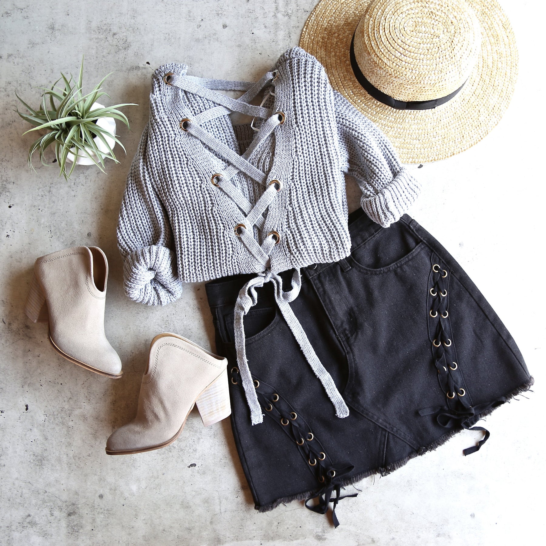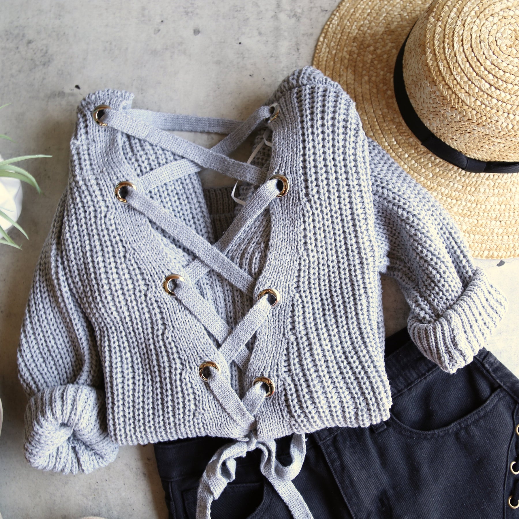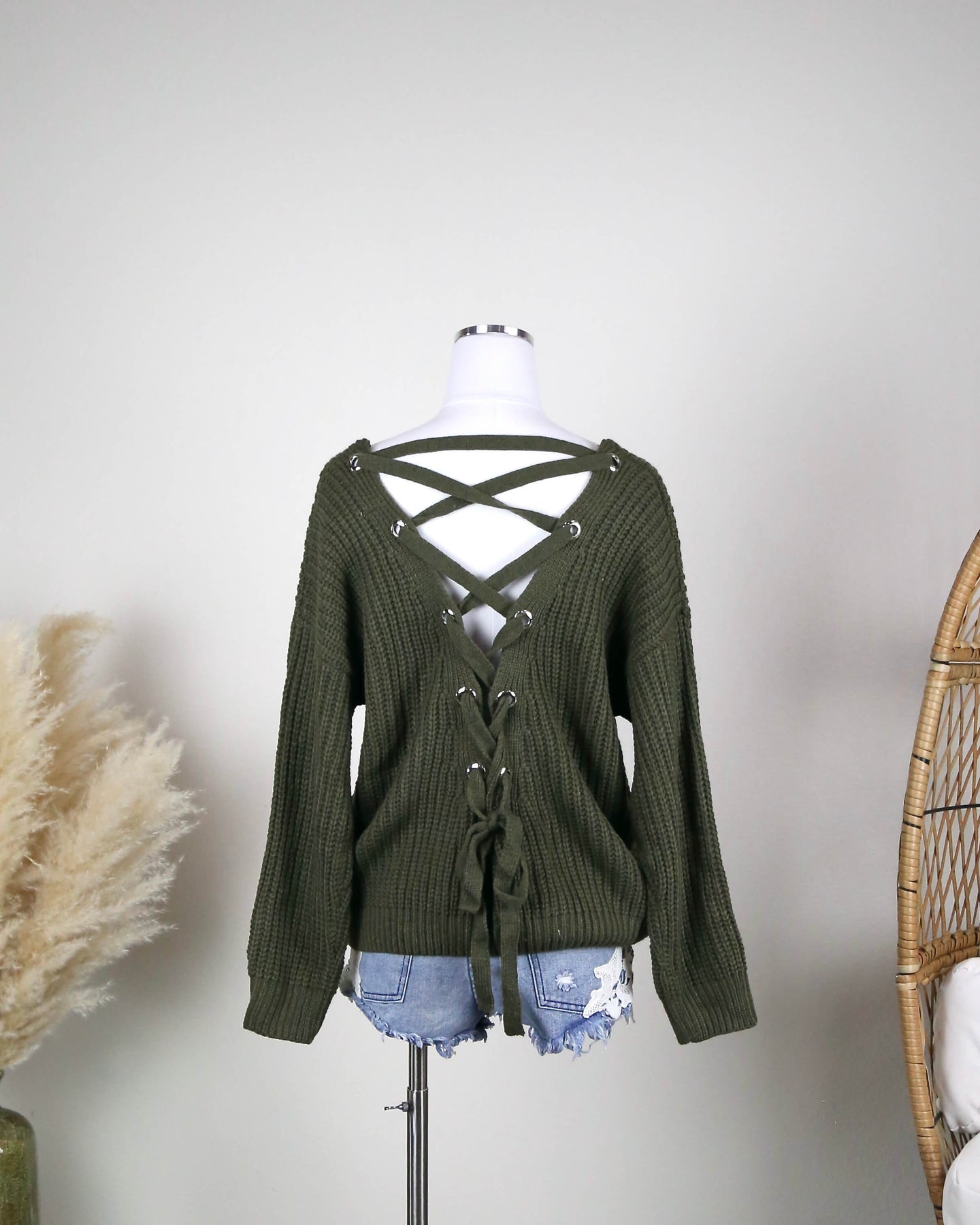 Sweaters are always needed, especially for the fall! This sweater features a grommet lace up back with an oversized fit. The length is perfect to wear over a pair of leggings and some cute booties!