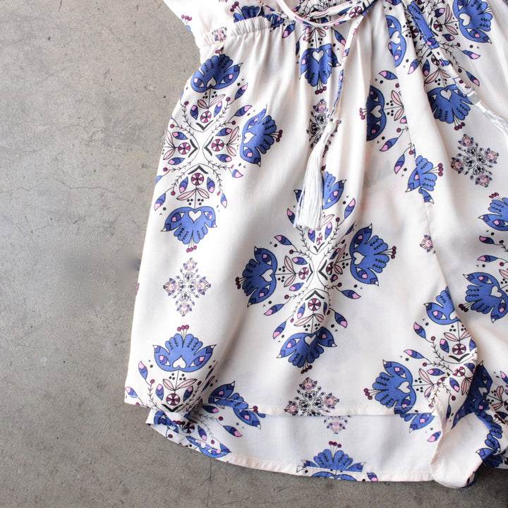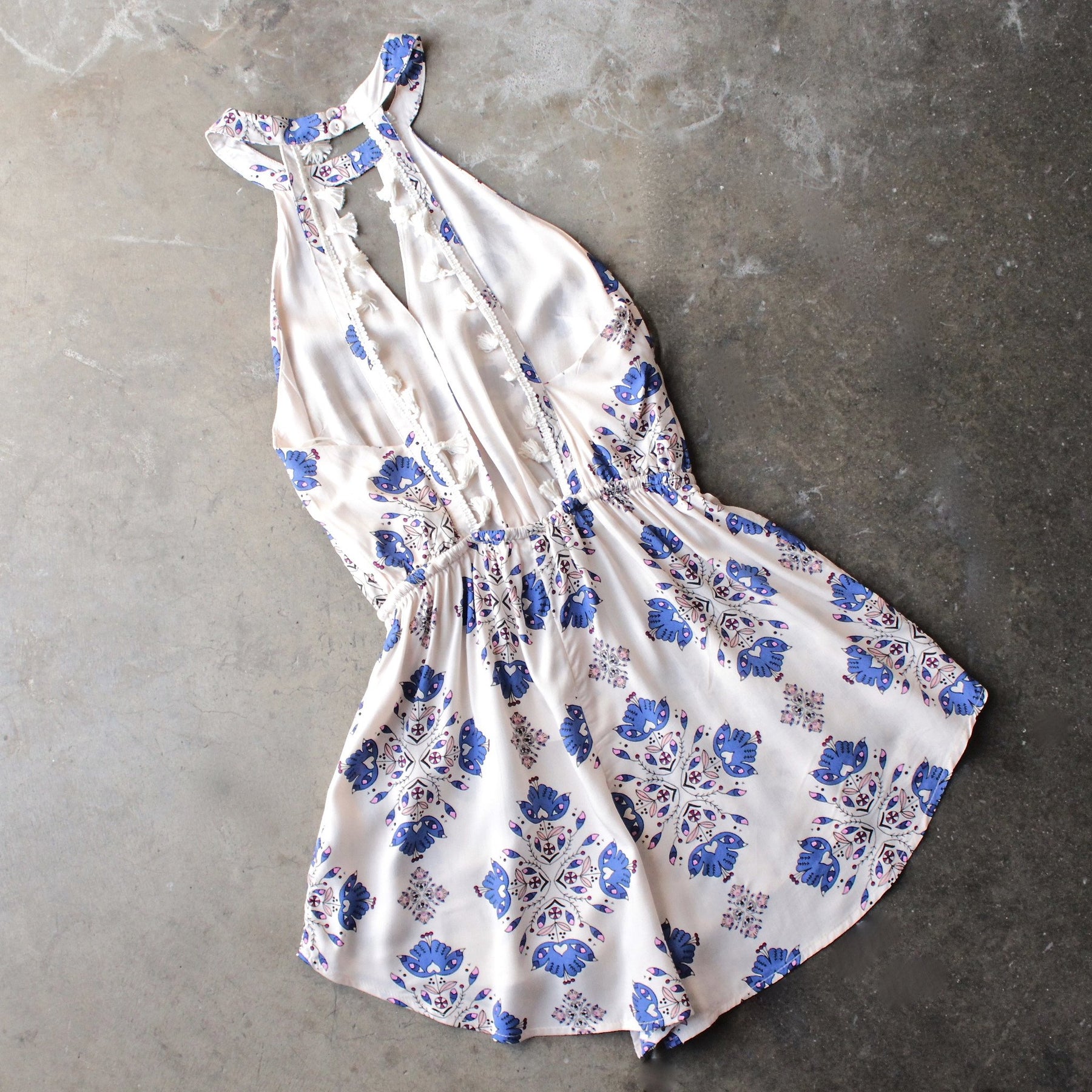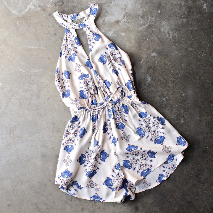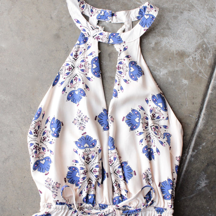 Eye catching print with halter neckline and deep V neckline. Cut out back with tassels detailing. Elasticated drawstring with tassels and polyester blend.
