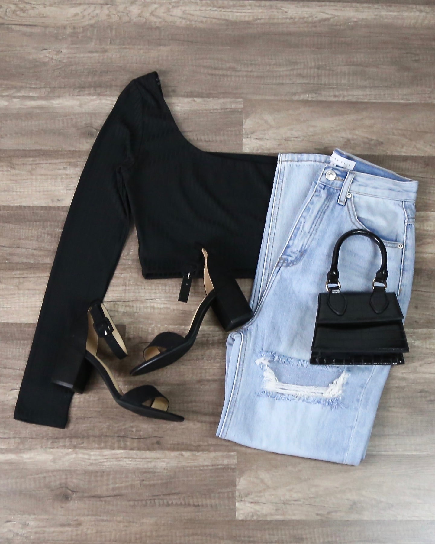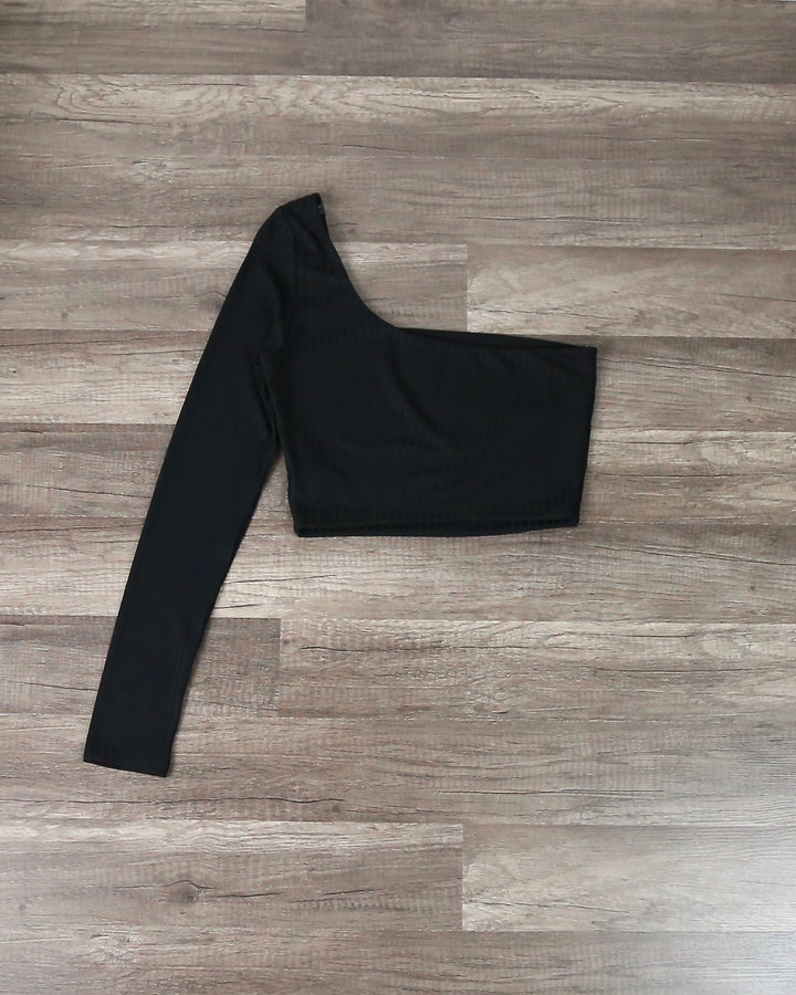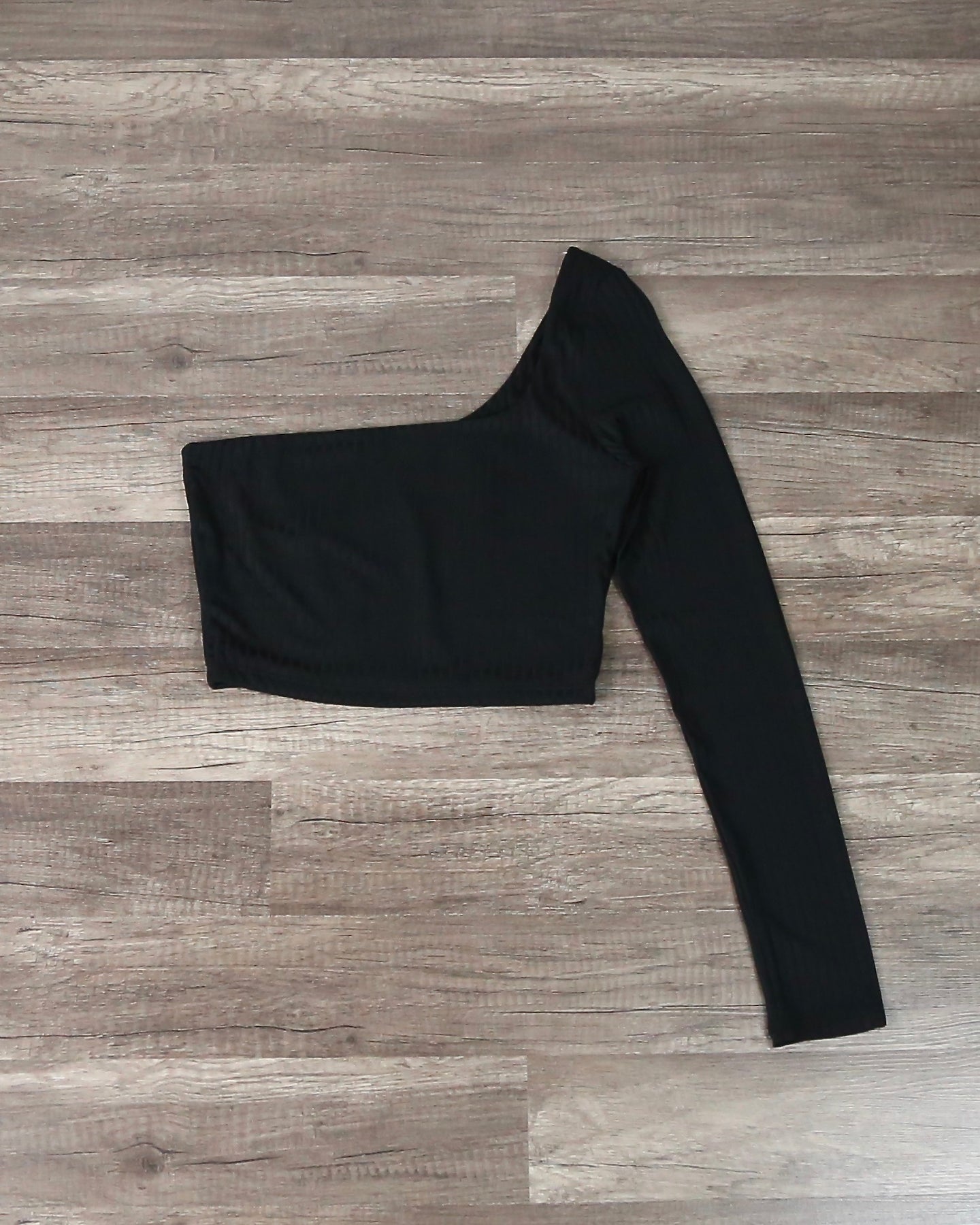 This elevated basic is perfect for any outfit! This one shoulder long sleeve crop top features a stretchy slinky rib material and double layering. Pair this top with a high waisted skirt and some ankle booties for the cutest look!