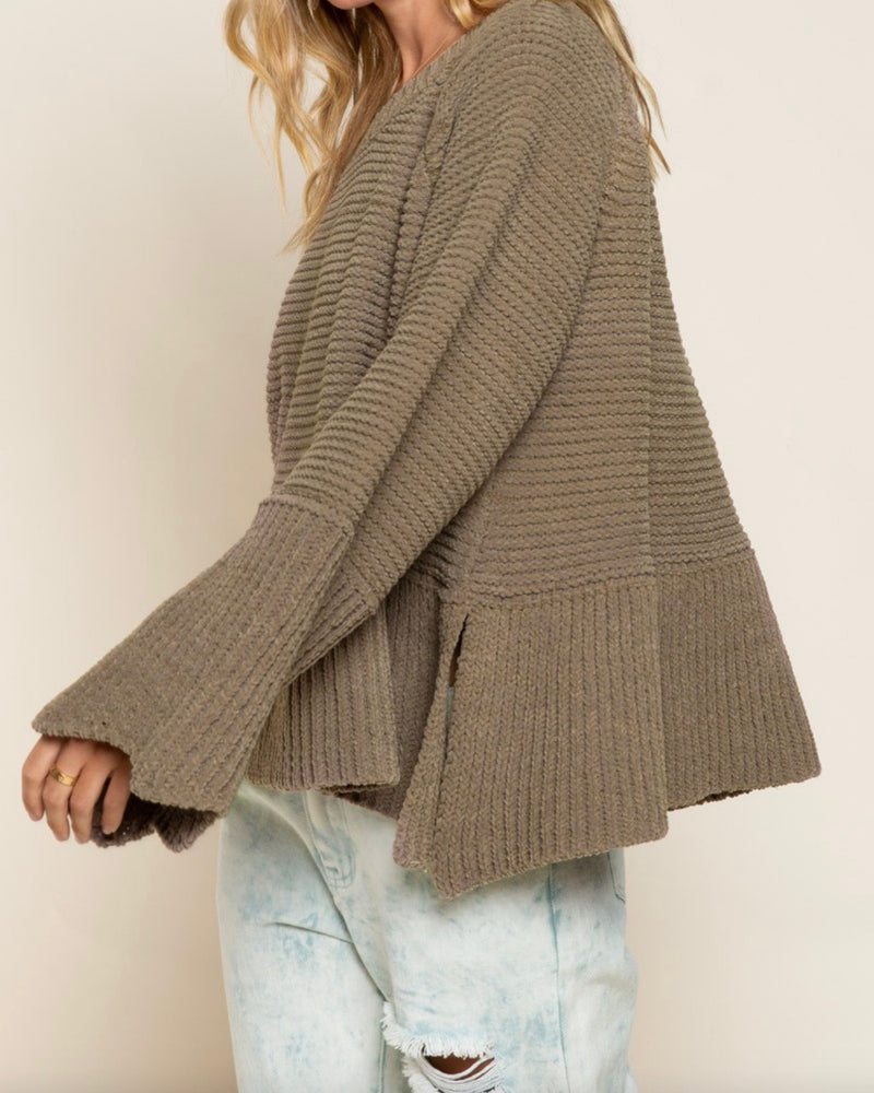 Relaxed Fit Scallop Edge Long Bell Sleeve Knit Sweater in Olive