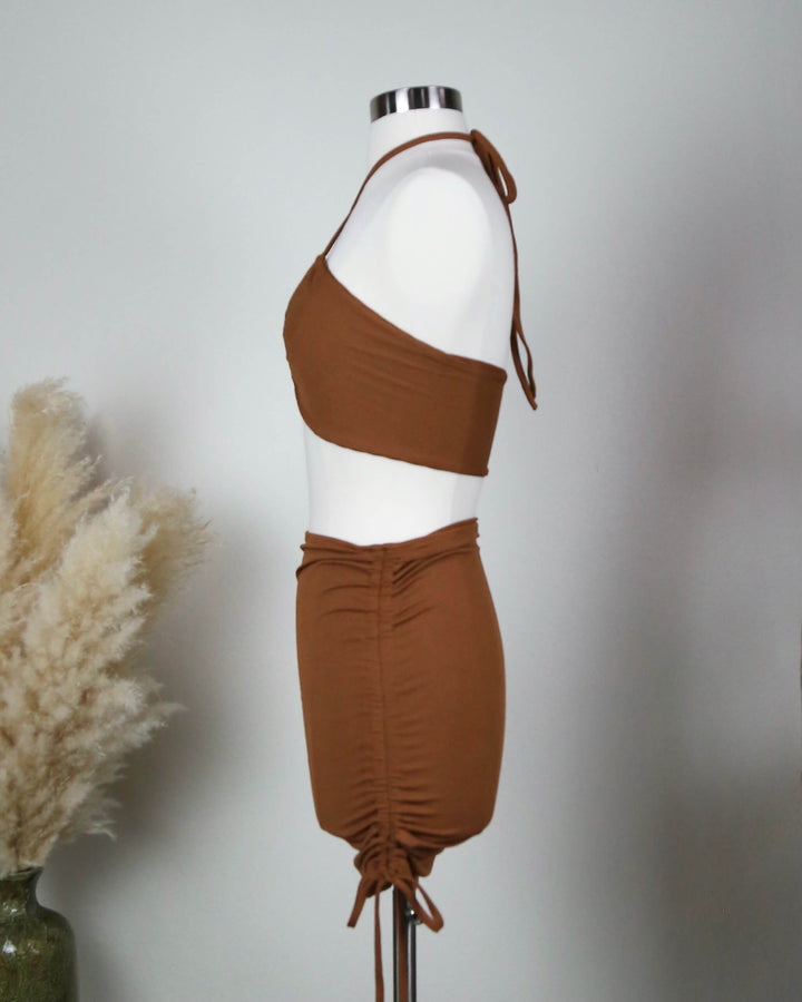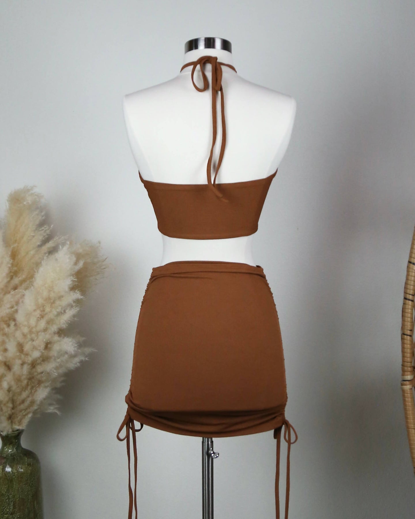 Super cute set that offers ton of stretch. This set features a ribbed fabrication, a halter neckline, and side ruched skirt. Unlined but opaque.