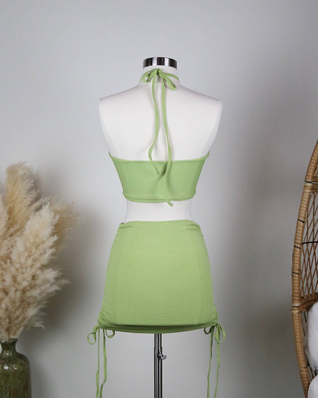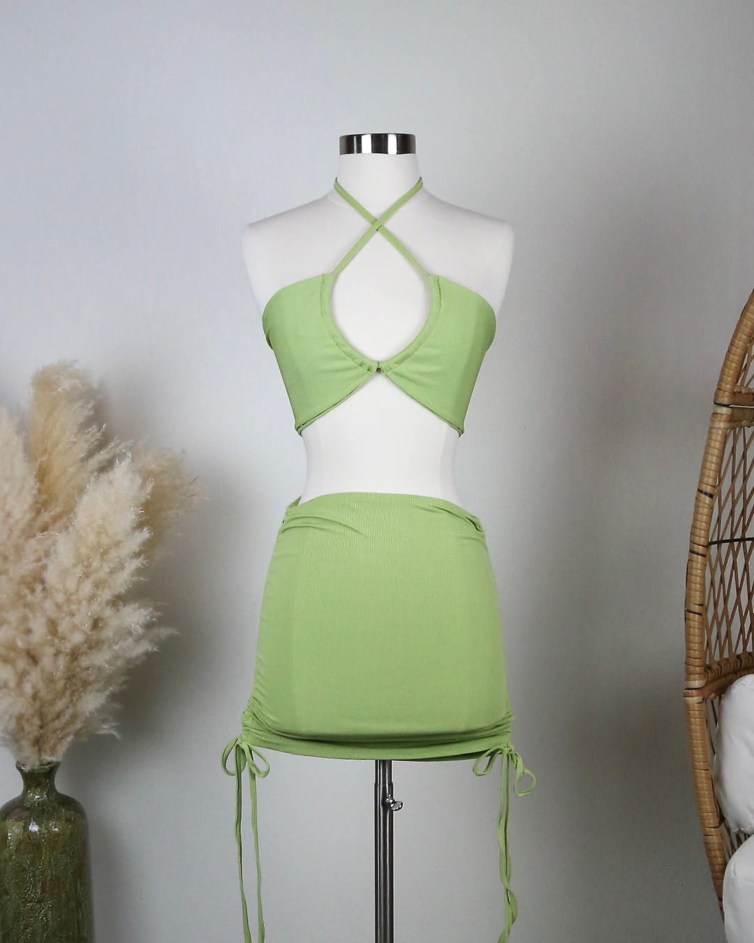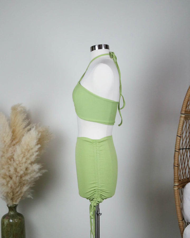 skirt set - two piece - halter top - ribbed - ruched side - cut out - green