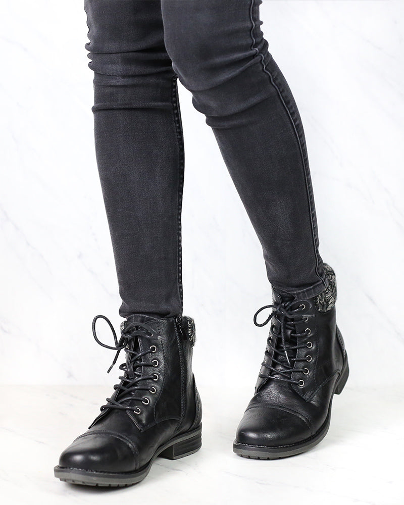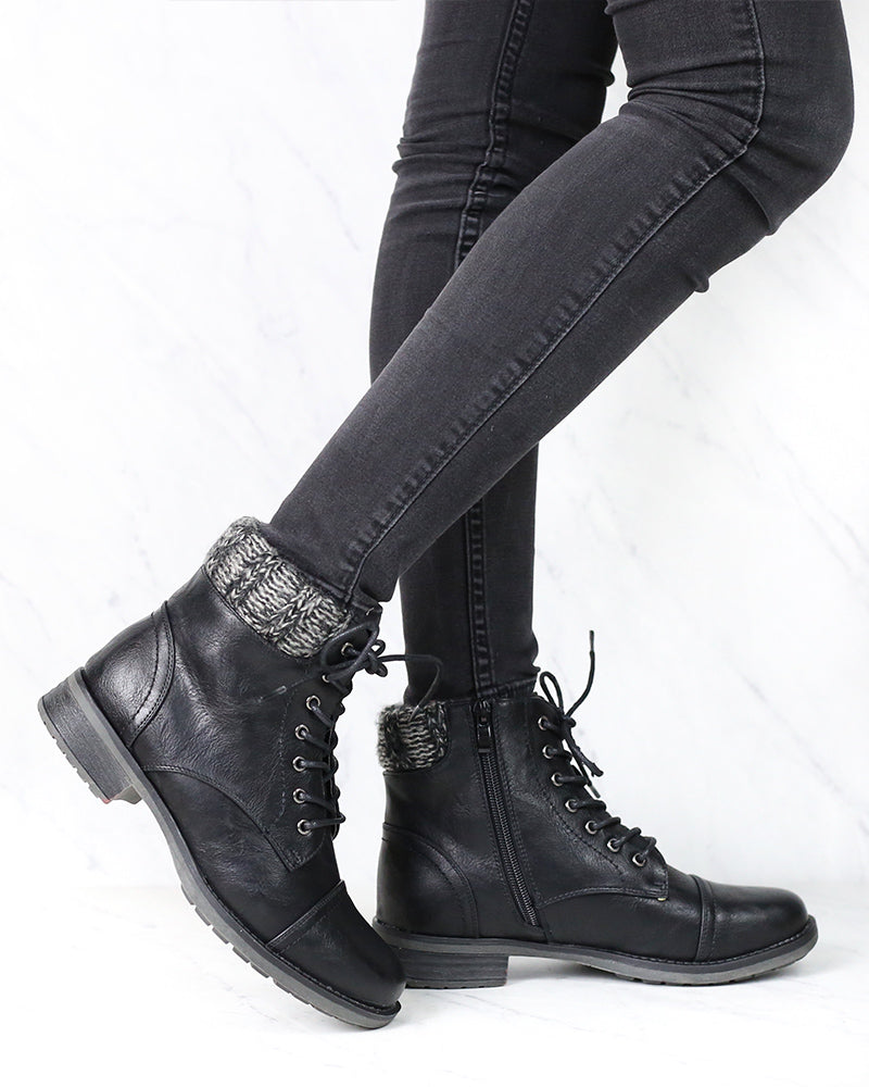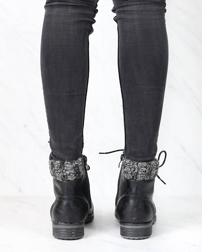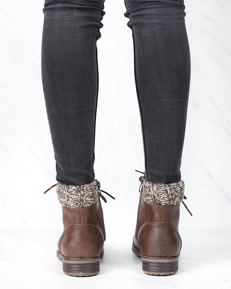 This ankle bootie features a sweater cuff to keep you warm on those cold winter days. Perfect for the fall and winter seasons, pair this with any outfit to stay warm and cute!
