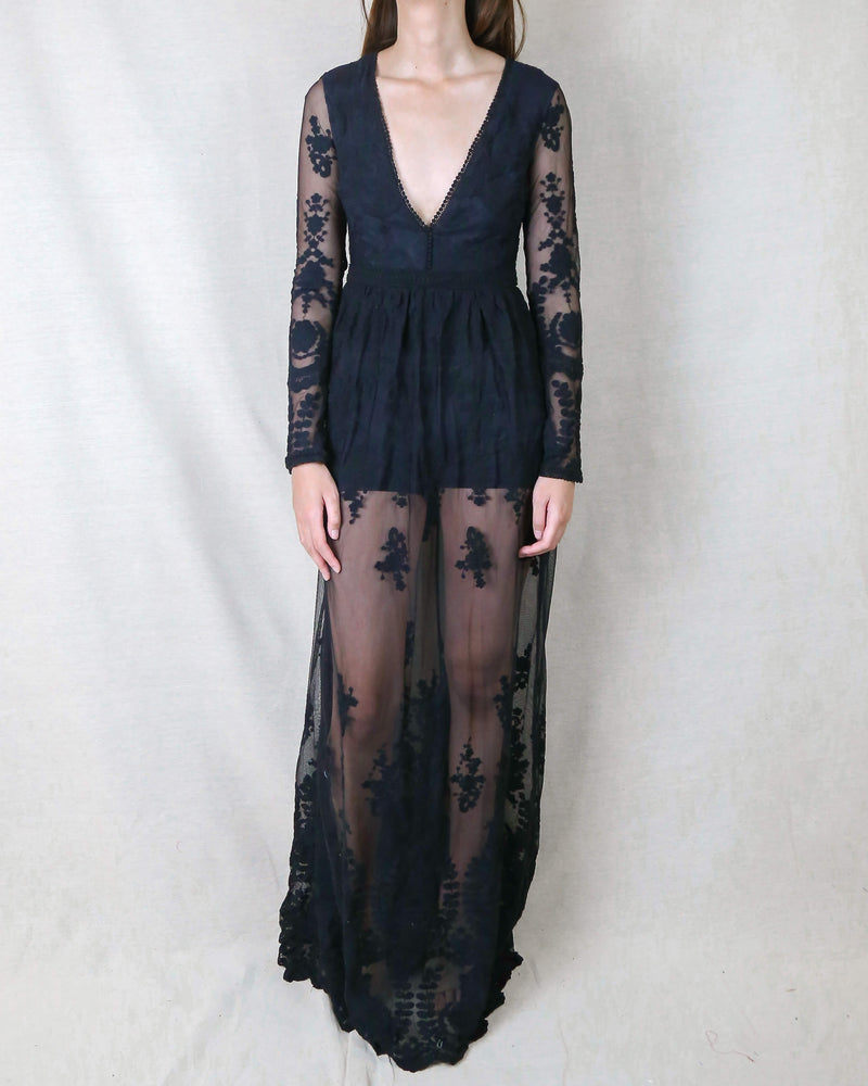 maxi romper - dress - embroidered - lace - v neck - long sleeve - black