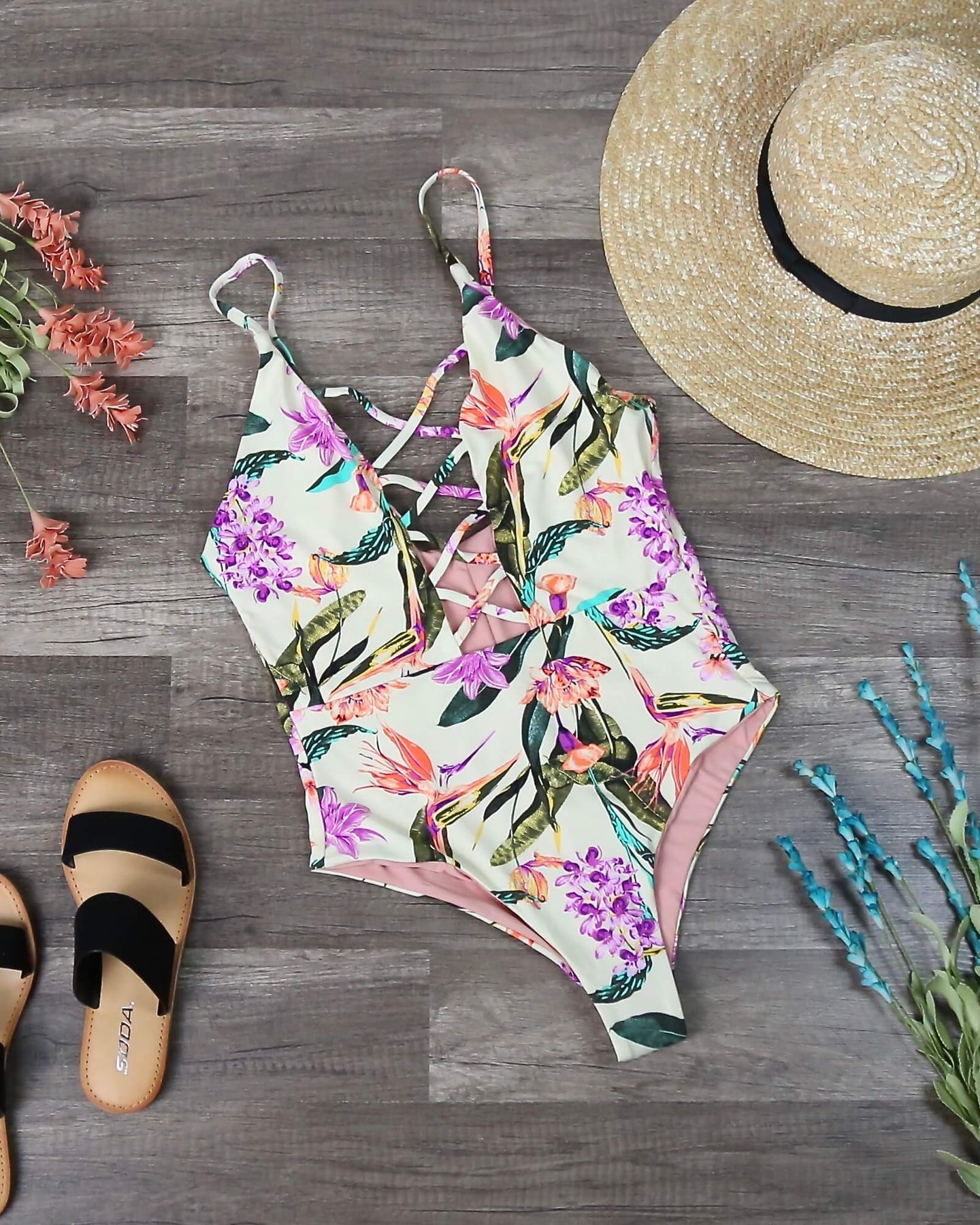 This gorgeous floral one piece swimsuit is a must-have for your tropical vacation! This one piece swimsuit can also double up as a bodysuit if you're just looking for a cute outfit. Wear this with your favorite pair of denim shorts for a cute summer vacation outfit!