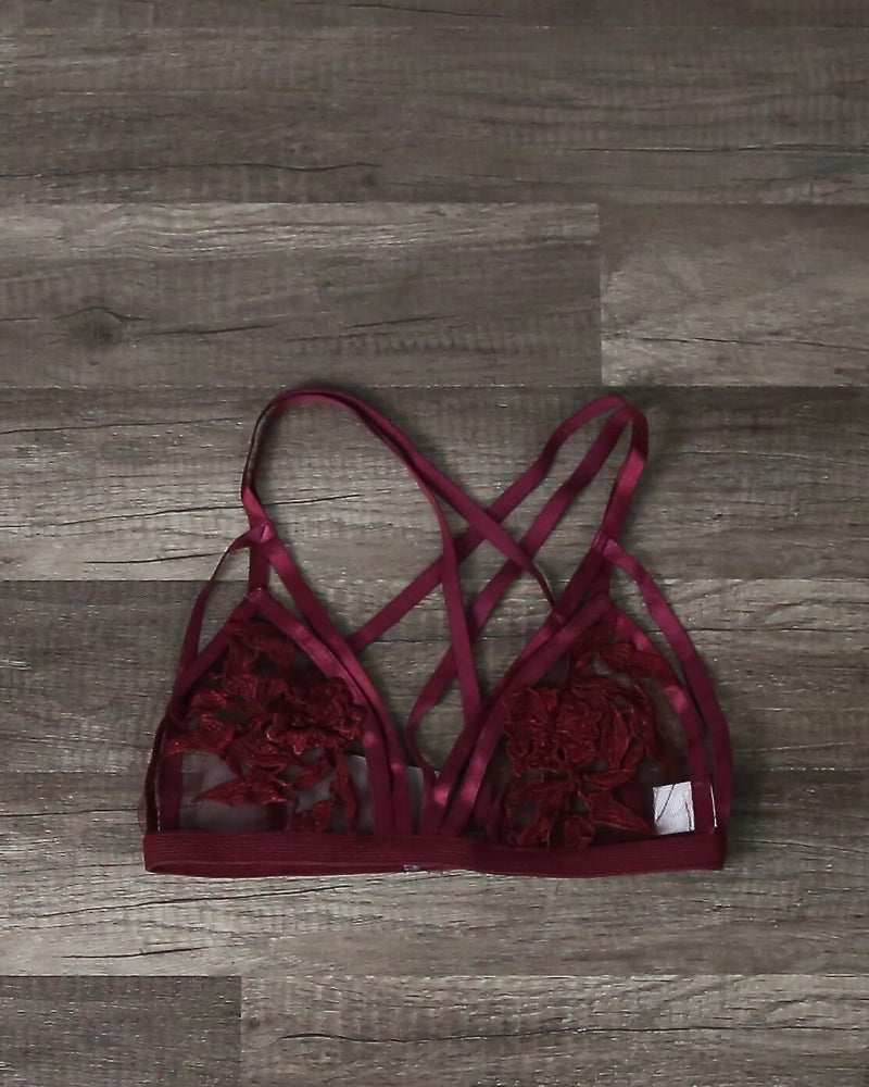 Gorgeous sheer strappy bralette that features a front floral lace design, criss cross back, and elastic band.
