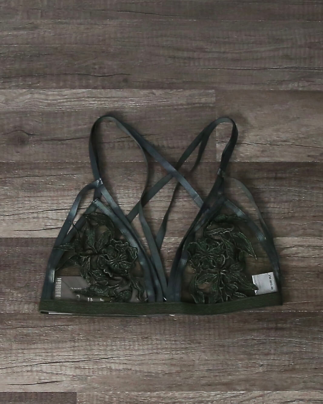 Gorgeous sheer strappy bralette that features a front floral lace design, criss cross back, and elastic band.