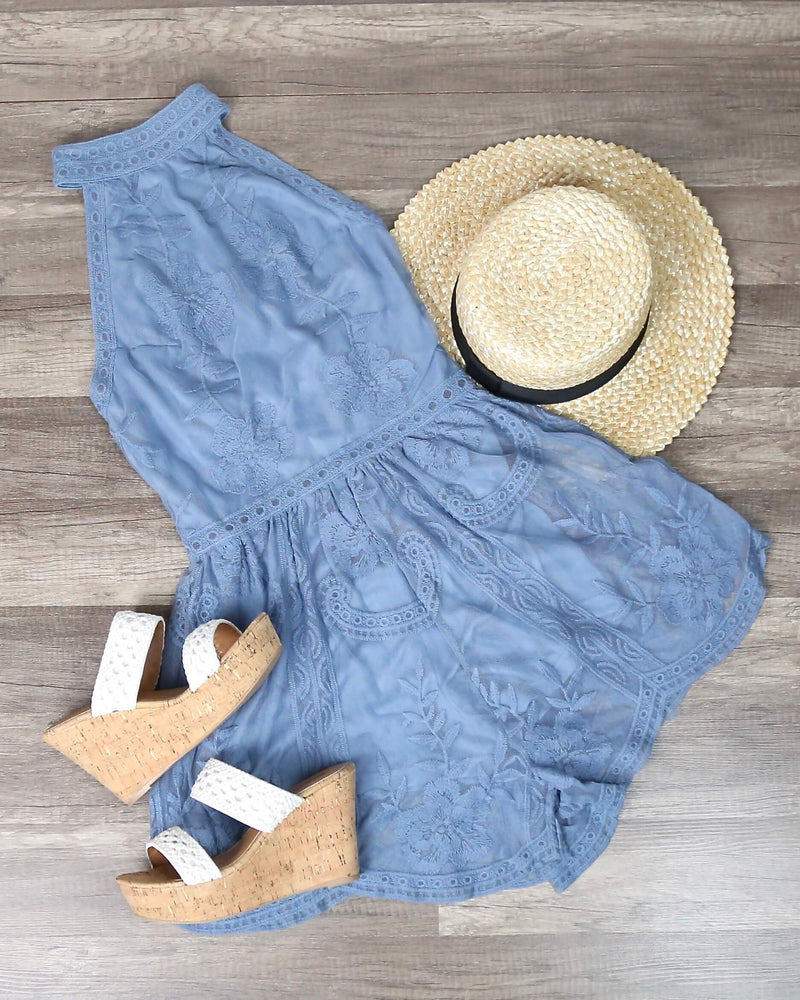 Sleepless & Sleeveless Halter Neck Mesh Lace Romper in Dusty Blue
