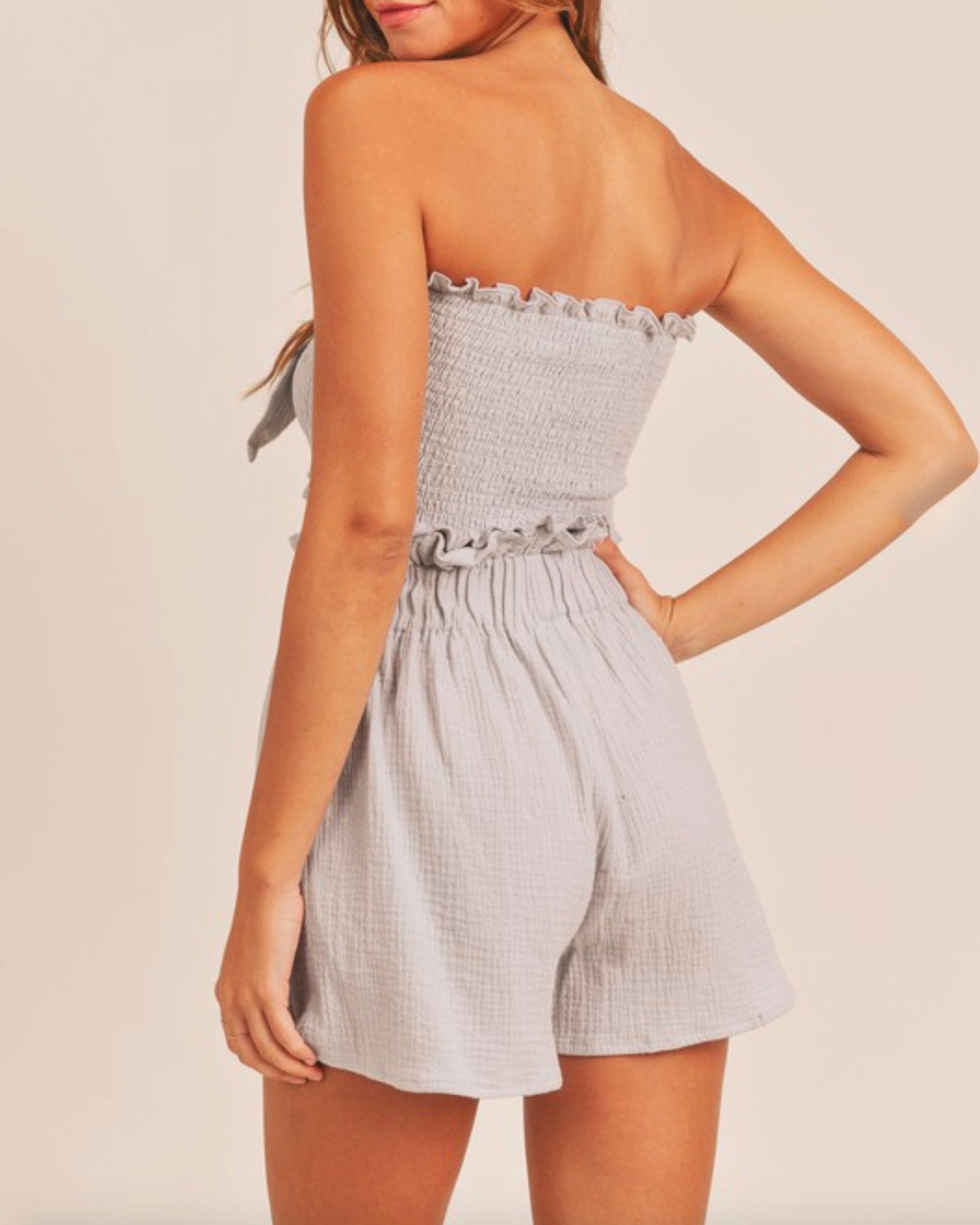 This set is guaranteed to make you the cutest in the room! Featuring a wrinkle gauze smocking tube top with a self ribbon tie and matching shoes with side pockets, this set is perfect when paired with some sandals or sneakers!