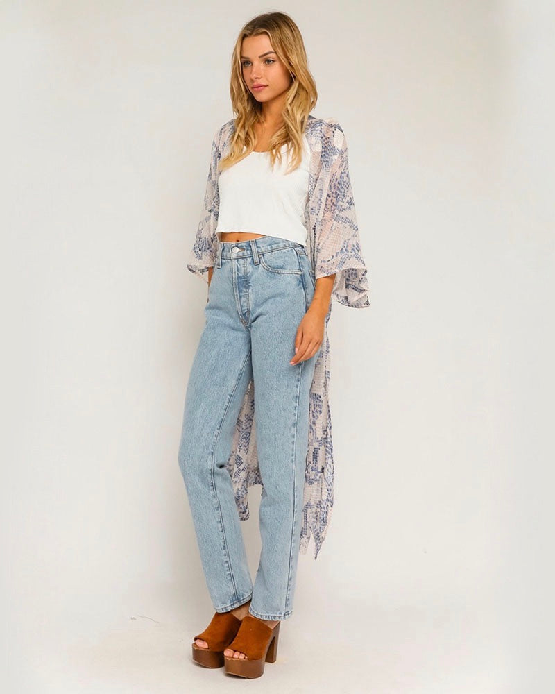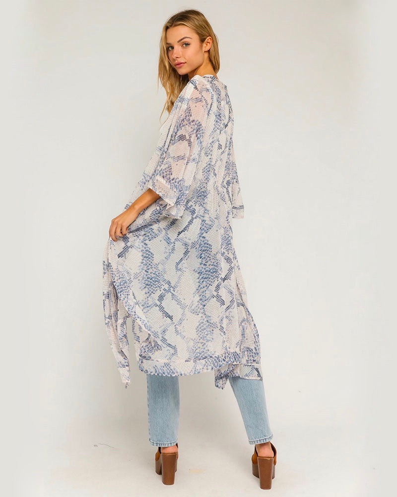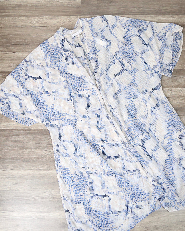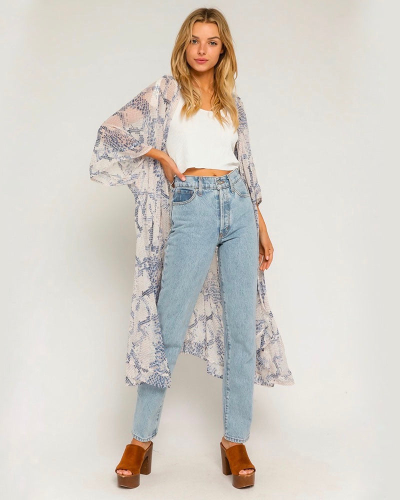 This stunning snake print open mini kimono duster in blush is a must-have piece to layer on top of your outfits! It's featured in a gorgeous snake print in a blush pink color which adds a chic and feminine touch to your outfit. Layer this on top of a crop top, high-waisted jeans, and booties for a super cute look!