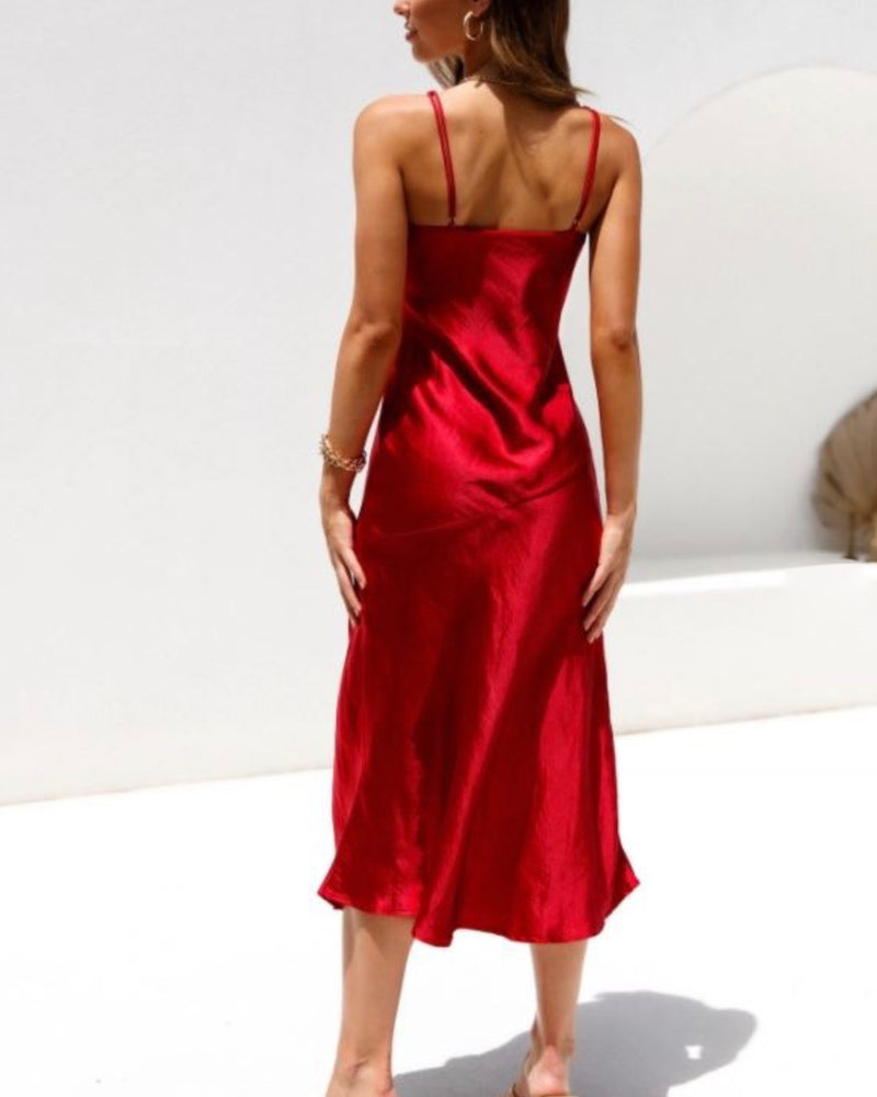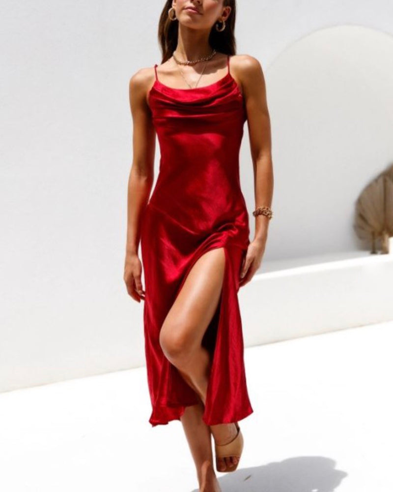 Looking for your next formal dress? This satin midi dress is perfect, featuring a round cowl neckline with pleated detailing on the bust, adjustable spaghetti straps, and a side slit at the thigh.