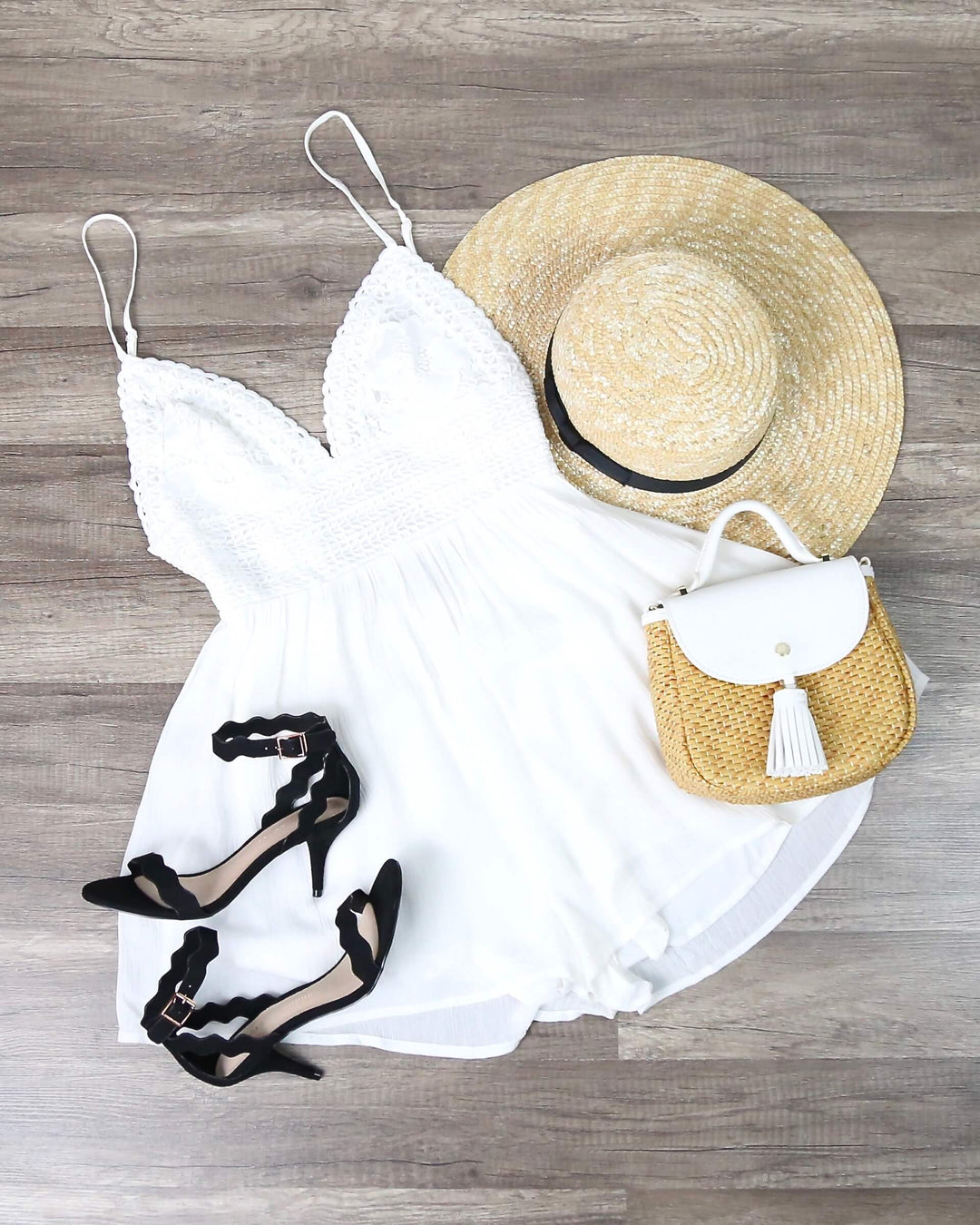 A laced romper with a padded lace bodice with tie up back and an adjustable strap. Perfect as a beach coverup. Pair this with your favorite pair of sandals for a cute and casual summer look.